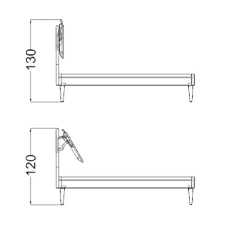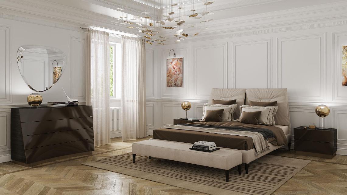 Padded bed upholstered in leather or fabric with details in shiny steel.Equipped with a mechanism to adjust the two headboards in various positions.Wooden legs in Canaletto walnut or Beluga oakwood