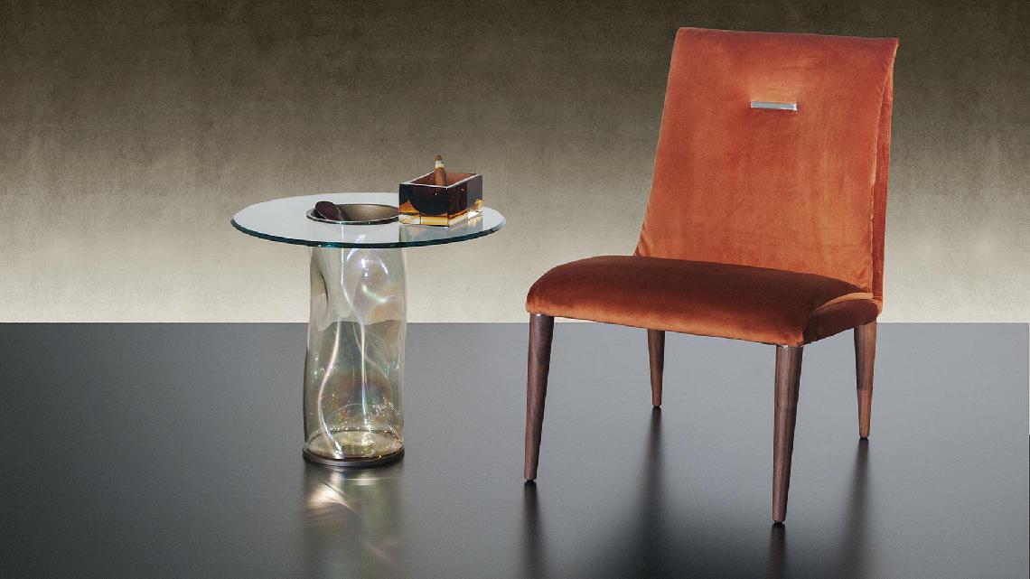 Armchair with internal metal structure and upholstery in leather, velvet or fabric. Shiny steel detail on the back. Legs in shiny nero beluga lacquered wood, Canaletto walnut or matt beluga Oakwood. Also available with wooden arms in Canaletto walnut or Beluga oakwood