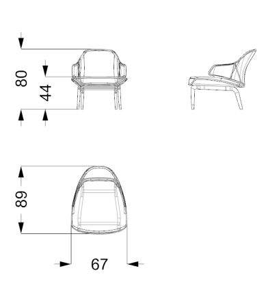 Armchair with shell in resin and wood with upholstery in leather or fabric. Internal back with quilting.