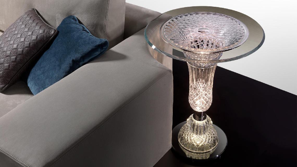 Modular sofa with wooden structure. Padded back cushions and plinth in satin brass finish. Upholstery available in fabric, velvet or leather. Characterised by a rounded section in the back on the armrest to place a side table and by a glass tile with artistic engravings applied on the front.