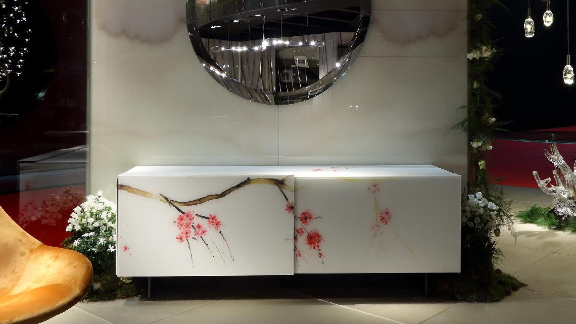 Sideboard with 2 sliding doors, covered in etched glass with decorative art printing.Optional legs in transparent glass or in brass or titanium finished metal