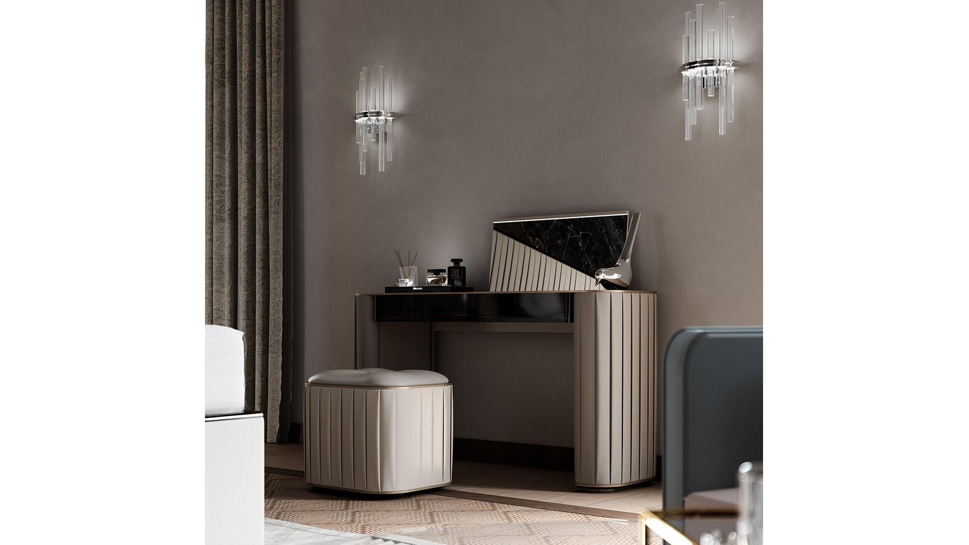 Pouf upholstered in pleated leather or fabric and profile in satin brass finish.