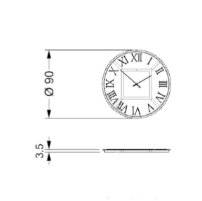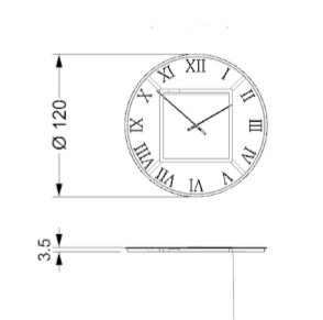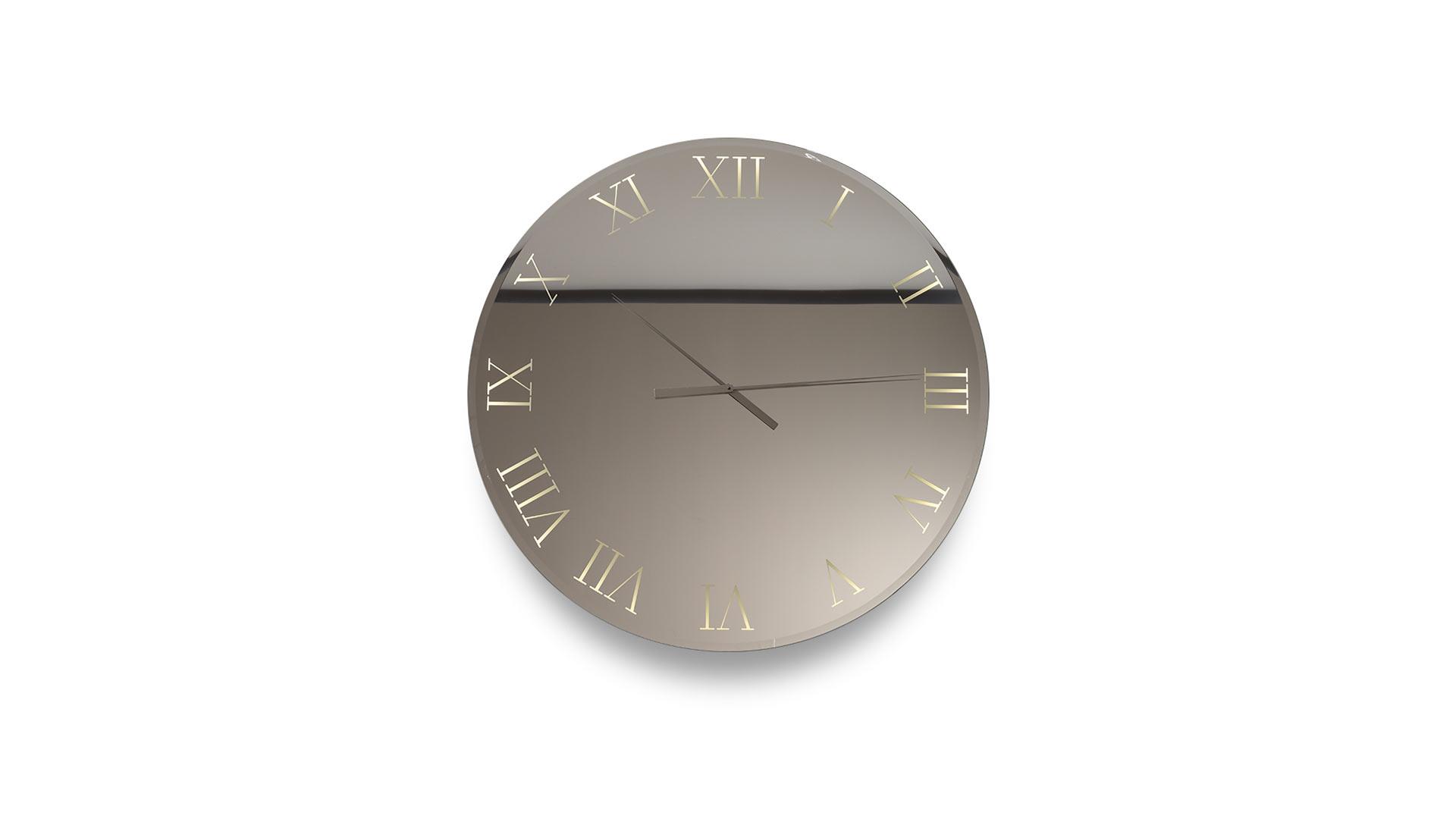 Round or rectangular mirror/clock in extraclear mirror glass with 20 mm bevel. Also available in smoke-grey mirror or in Antique Mirror or in Marble glass. Roman numerals in smoke-grey serigraphy and hands in titanium. Optional back LED lighting.
