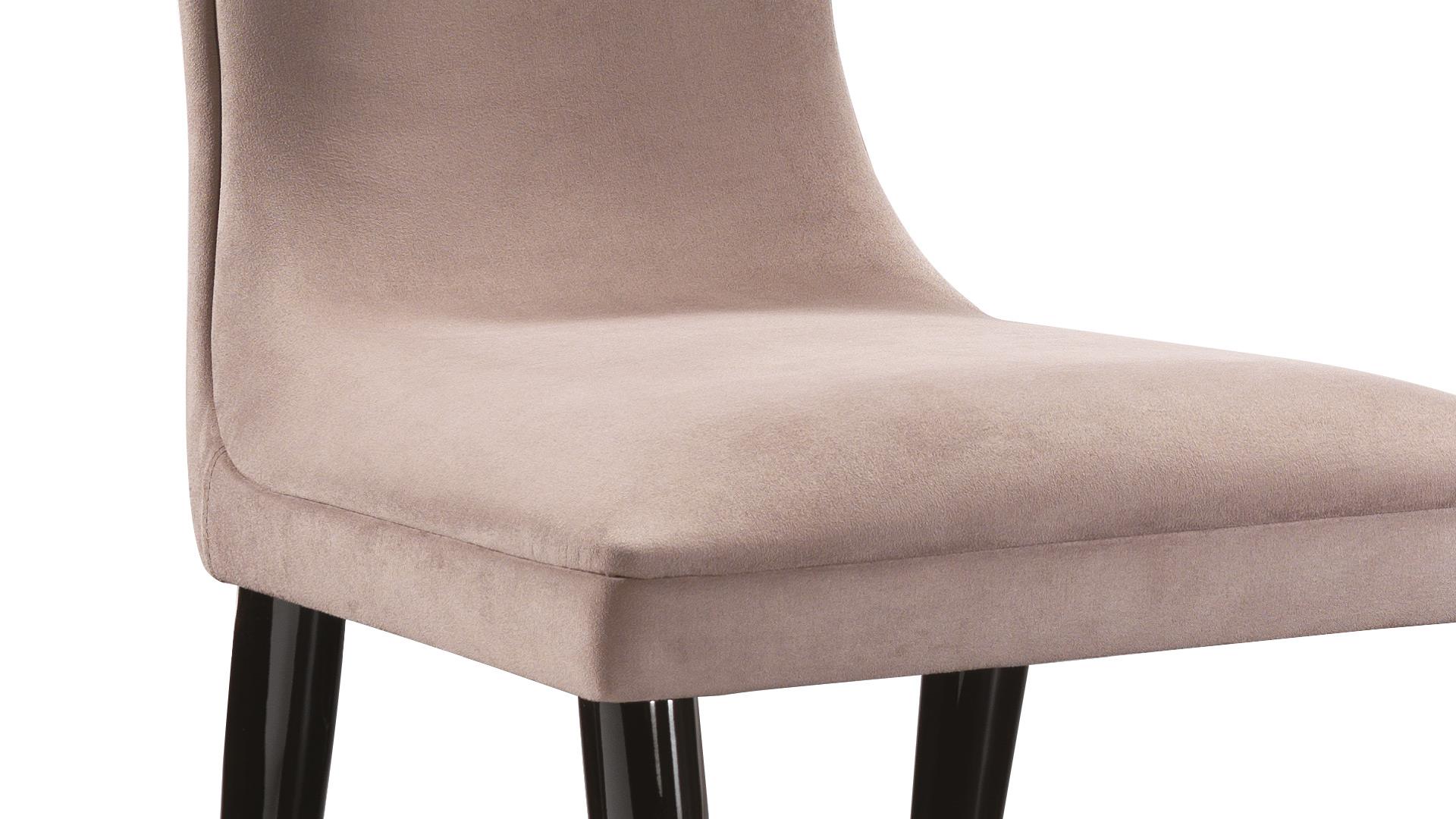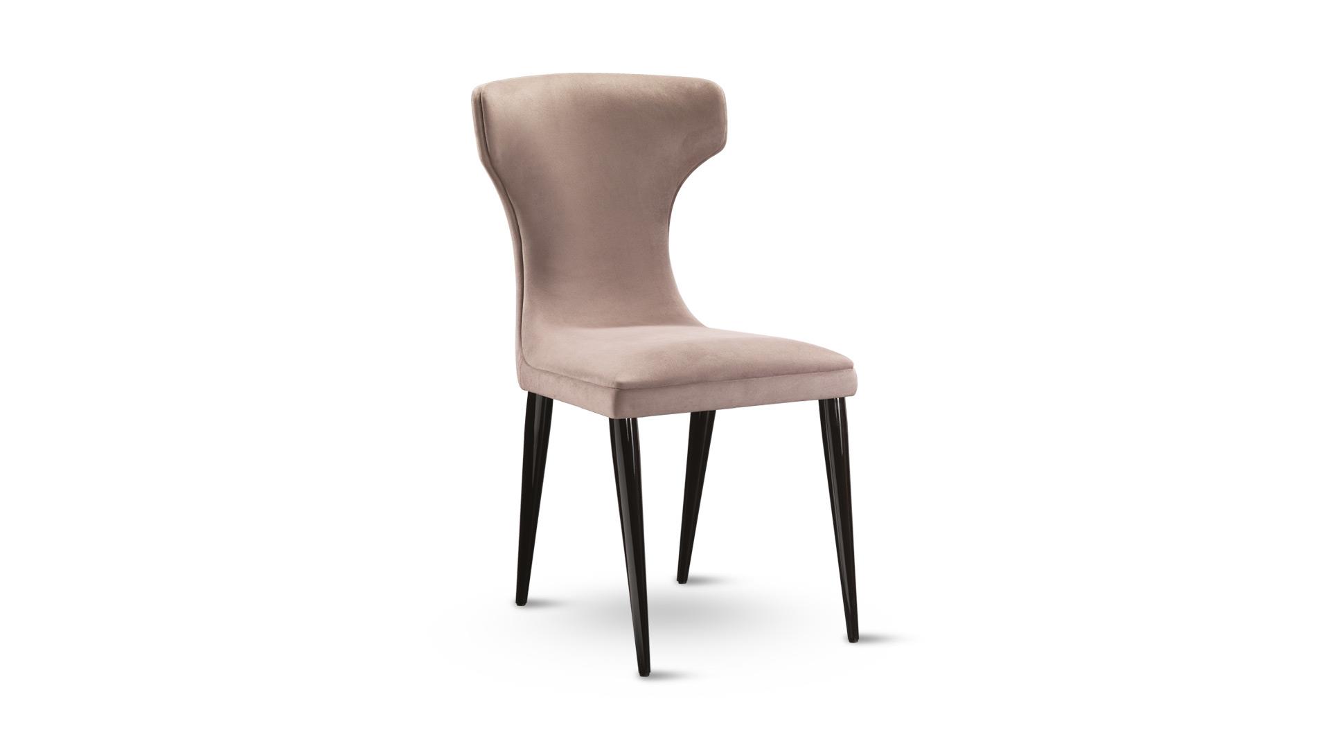 Chair with foamed structure. Available with wooden legs in nero beluga shiny lacquered finish or with metal base with chromed or satin brass finish. Upholstery in fabric, velvet or in leather.