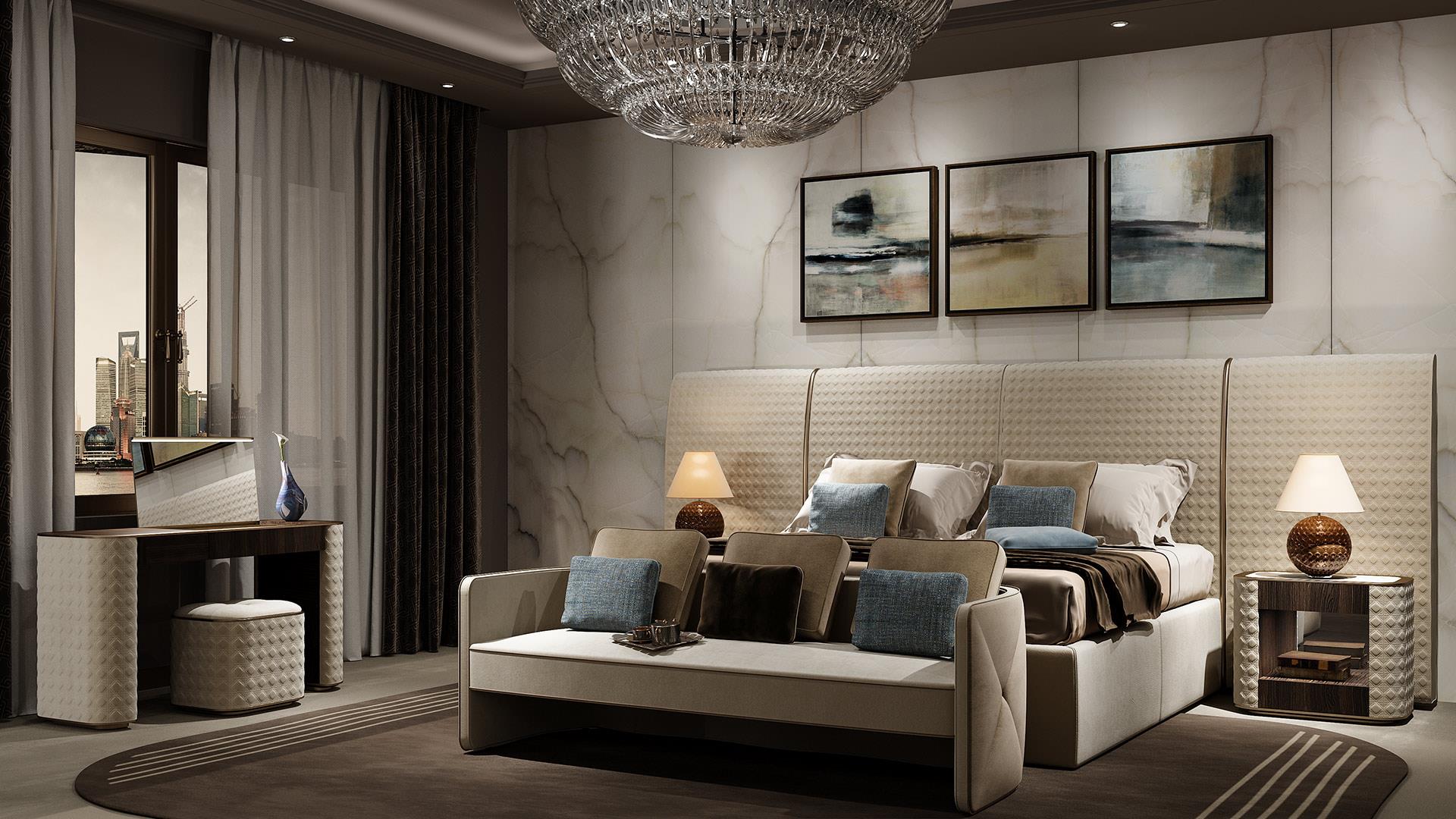 Padded bed upholstered in leather or fabric with San Marco quilting on the headboard.