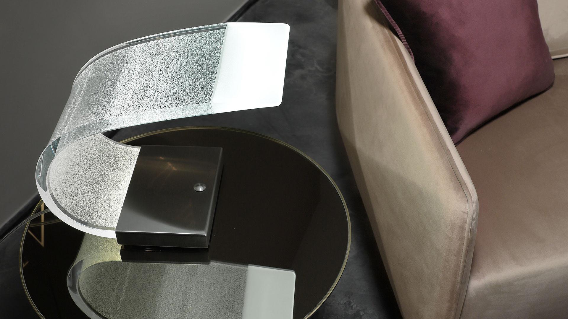 Table lamp in extraclear curved and bush-hammered 19mm thick glass with supports glazed inox steel. LED lighting system.