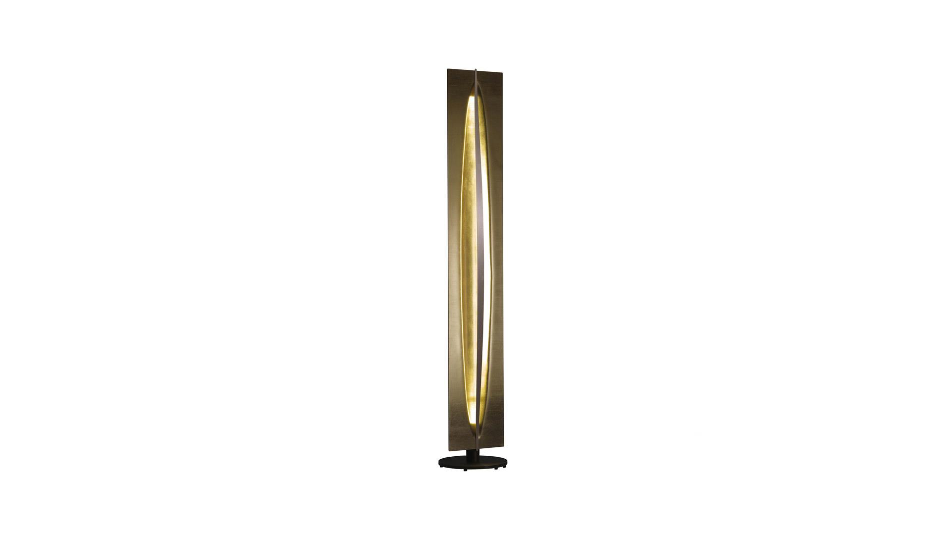 Floor lamp in extra clear curved glass 5 mm thick in gold leaf finish on swivel base in etched lacquered glass, creta colour. Metal support in brass finish. Vertical bar in burnished brass with LED STRIP