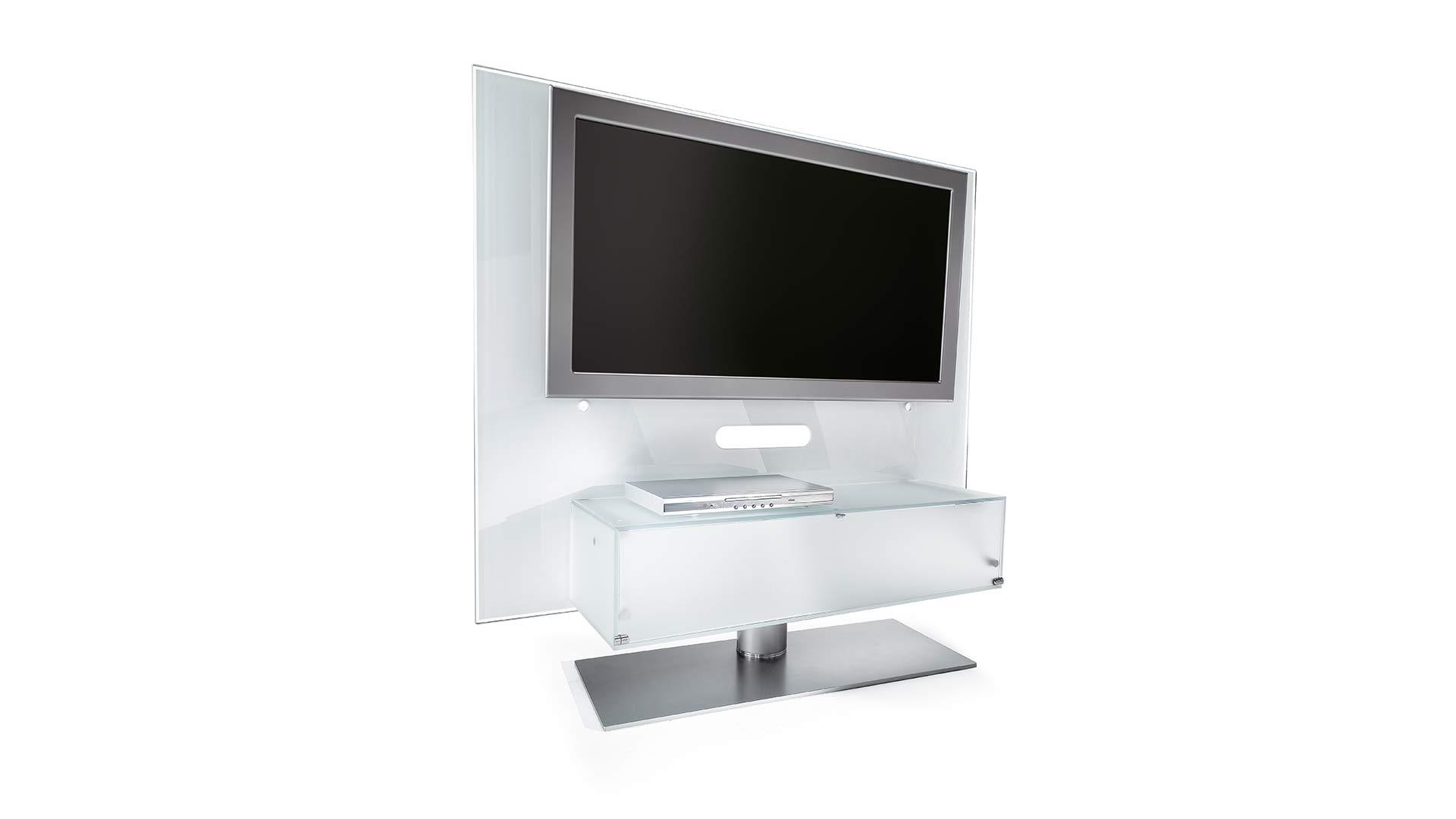 FLAT: TV stand with 30° turning mechanism. Back in tempered extra-clear frosted glass with adjustable TV-support and metal base in titanium finish. Optional: glass shelf or box container in extra-clear etched glass with cable-hole and folding door.