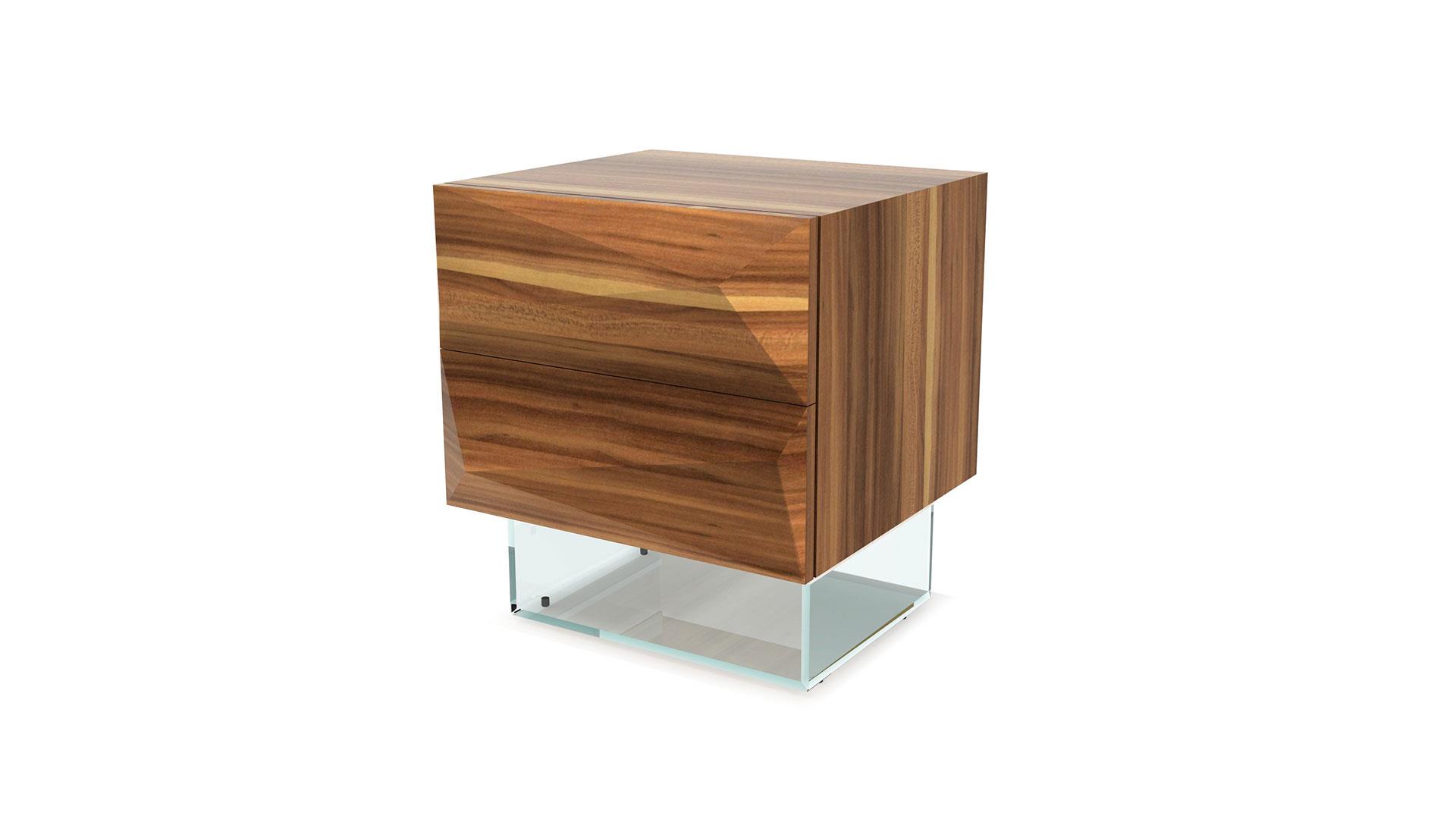 Night stand with 2 drawers in Canaletto walnut or matt lacquered finish and base in transparent glass.