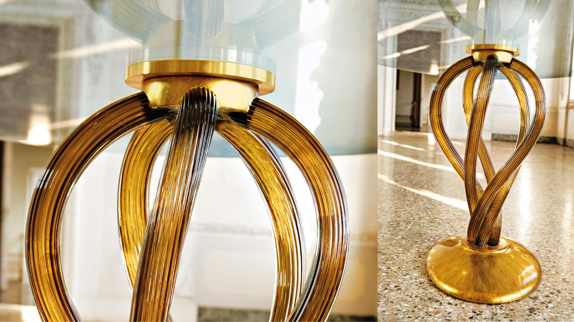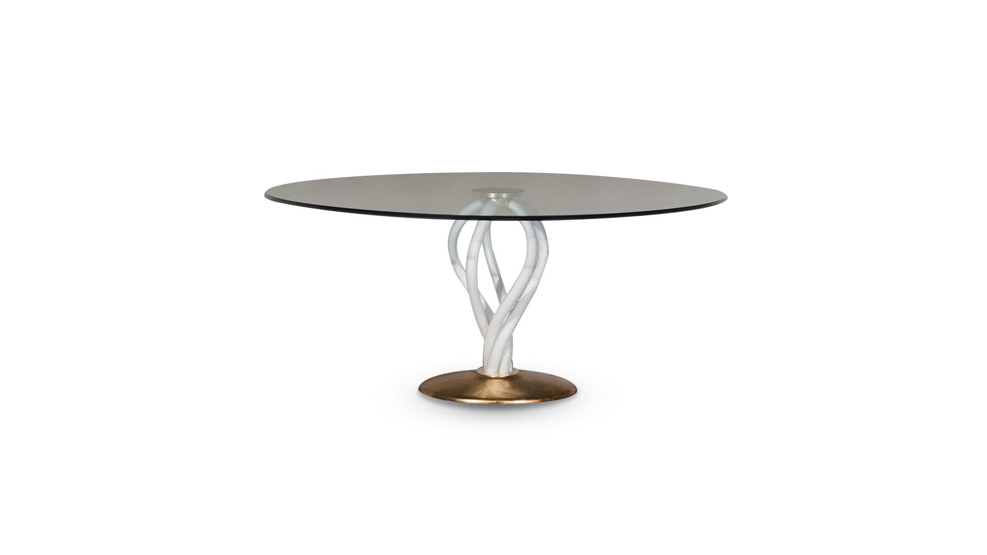 Dining table with base in smooth Murano glass in emerald green, blue, red or white with sandblasted finish or in ribbed glass transparent, white coated, tea or gold. Plinth and supports in gold or silver leaf. Glass top 15mm thick with OG bevel.