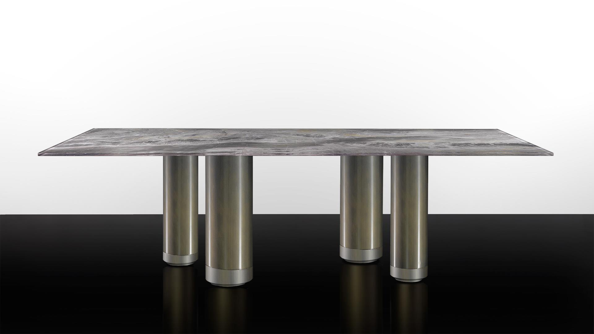 Dining table with base composed by cylinders in various diameters painted in shiny dark brass finish with a bottom section in satin matt brass. Junction plate in shiny steel.