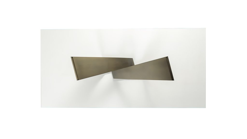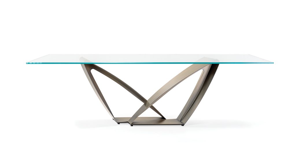 Tavolo pranzo con base in ferro finitura Bronze (100M). Piano in vetro, vetro extrachiaro, vetro fumè, MarmoReflex o LegnoReflex. Piano Bevel Wood in Noce Canaletto o in Canaletto Henné. Piano Bevel Wood Bronze (100M) con cover in Marmoreflex/Legnoreflex.Base disponibile anche in finitura ottone (104M), ottone dark (105M), titanium (101M).