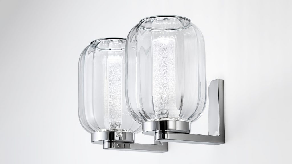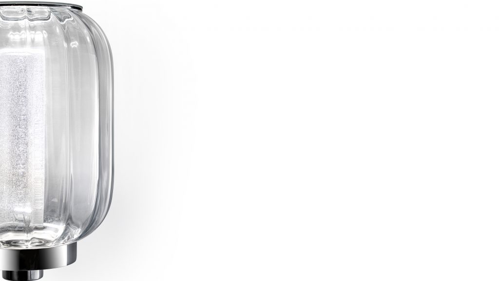 Applique della collezione Lanterna. Realizzata in vetro artistico nei colori trasparente, acquamarina, paglierino. Diffusore interno in vetro finitura Rugiada e coperchio in vetro con magnete. Supporto in metallo cromato lucido e impianto luce a LED.