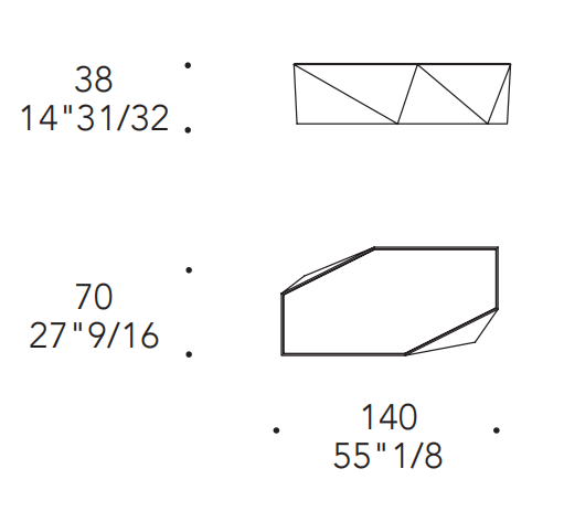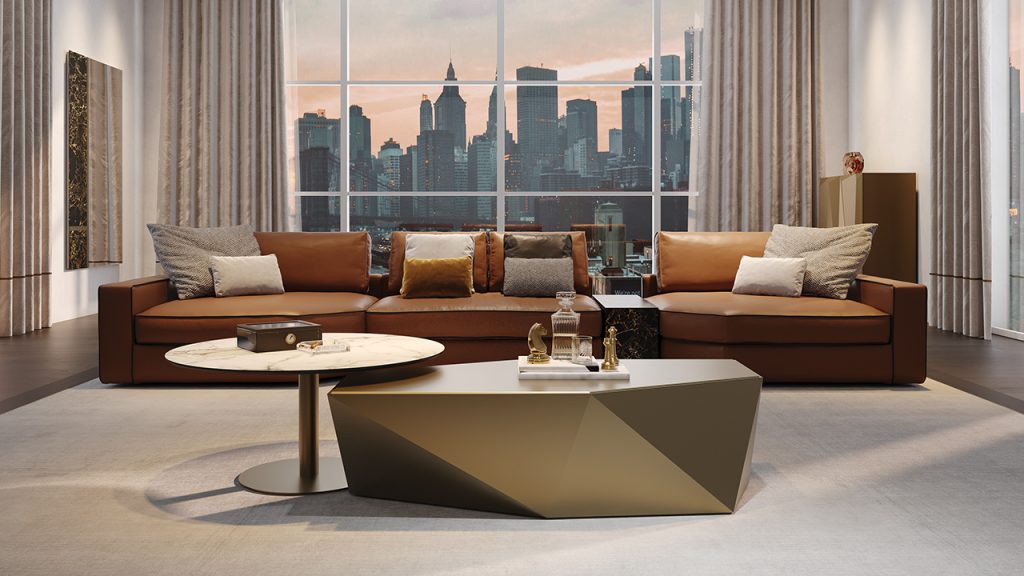 Tavolino da salotto in legno sfaccettato in finitura Bronze(100M), ottone (104M), ottone dark (105M), titanium (101M), rame (107M), oro (103M) con top in vetro in tinta.