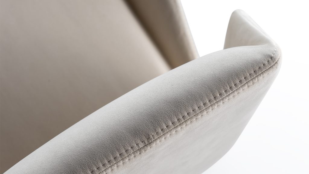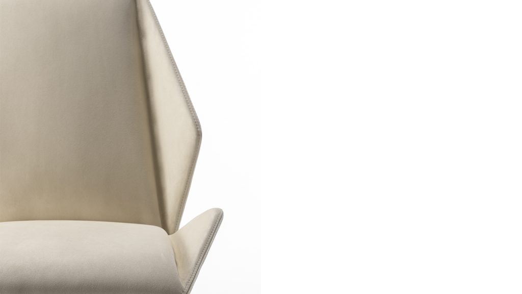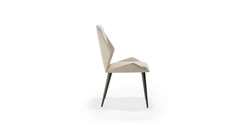Sedia con struttura in legno, struttura e schienale imbottiti. Gambe in rovere Beluga o finitura Bronze 100M, ?in ottone (104M), ottone dark (105M), titanium (101M).