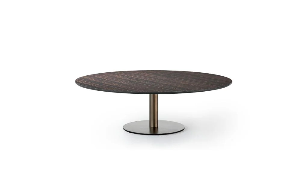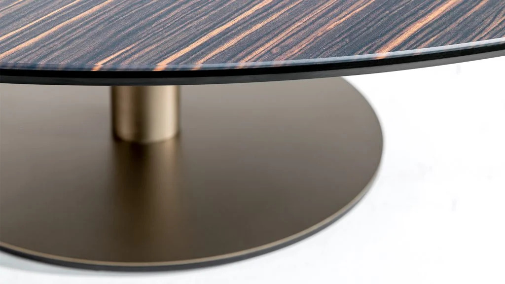 Tavolini con piani in MarmoReflex e LegnoReflex. Base in metallo finitura Bronze o in finitura metallica satinata.