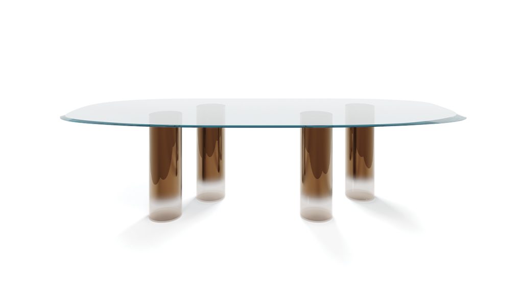 Tavolo da pranzo con base a cilindri in vetro di Murano nei colori trasparente, rosso, blu, acquamarina, ambra, ametista e tabacco, oppure in finitura sputtering sfumata bronzo, argento o rame. Piano in MarmoReflex o LegnoReflex con filo wing.