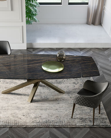 Il tavolo Atlante è interamente in legno, disponibile nelle finiture noce canaletto e rovere coke termo-trattato. Le gambe a cavalletto della larghezza di 17 cm gli conferiscono un aspetto maestoso. La bisellatura del piano mette in risalto le calde venature del legno. Il tavolo è dotato di un sistema di allunghe con guide in alluminio anodizzato. Le allunghe, da 40 cm, sono interne in biglia con il