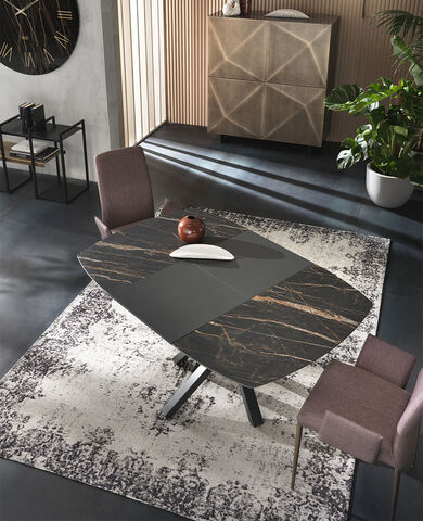 Il tavolo Atlante è interamente in legno, disponibile nelle finiture noce canaletto e rovere coke termo-trattato. Le gambe a cavalletto della larghezza di 17 cm gli conferiscono un aspetto maestoso. La bisellatura del piano mette in risalto le calde venature del legno. Il tavolo è dotato di un sistema di allunghe con guide in alluminio anodizzato. Le allunghe, da 40 cm, sono interne in biglia con il