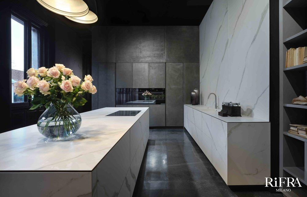 Finitura mobili isola e quinte: cemento nero spatolato a mano.