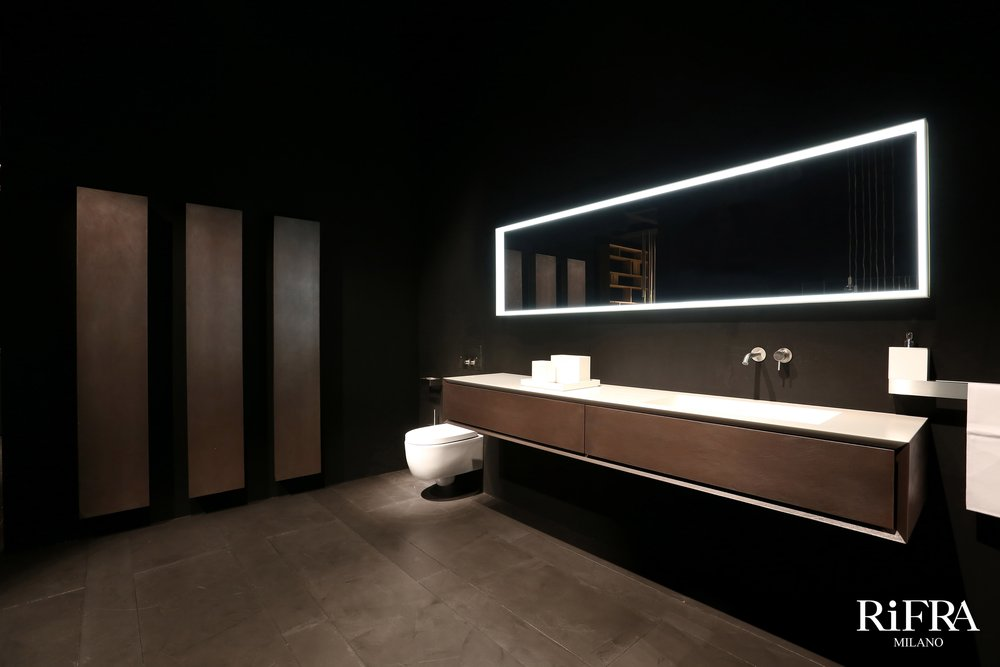 Finitura mobili isola e quinte: cemento nero spatolato a mano.
