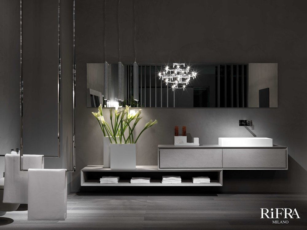 Finitura mobili isola e quinte: cemento nero spatolato a mano.