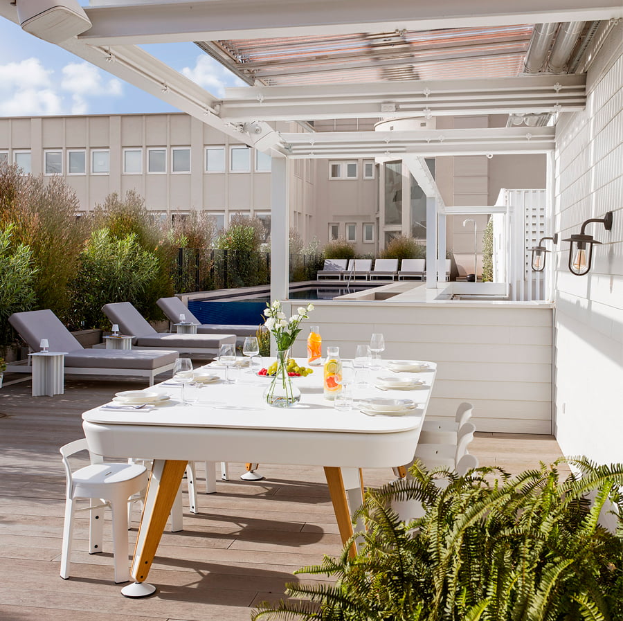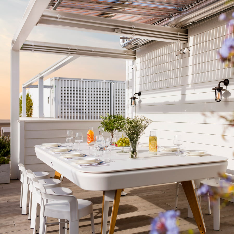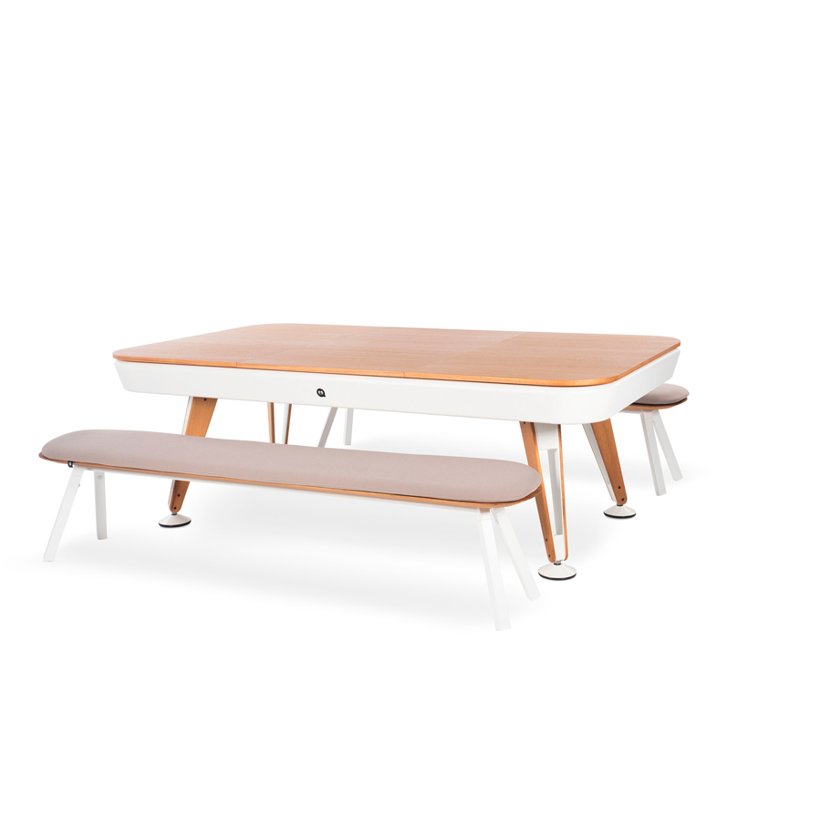 The dining top is available in iroko, walnut or oak wood (for indoor use) or in Fenix (for outdoor use), in the two sizes of the Diagonal pool table. A large dining table. A fabulous pool table.