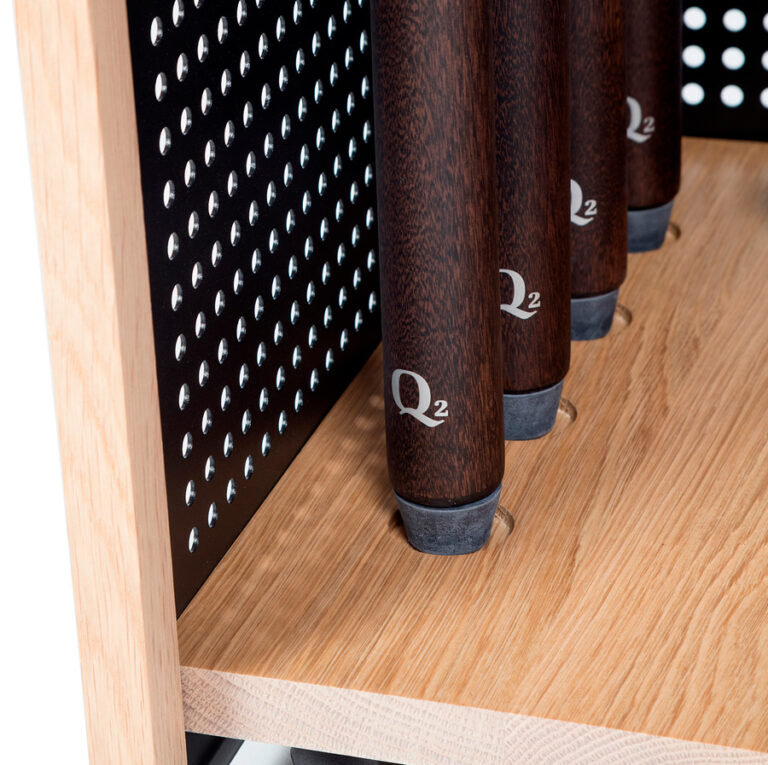 The floor cue rack is manufactured in high-quality materials. It has a steel structure with a polyester paint finish in black, white, red, green and blue. Its storage shelves and edging come in iroko, walnut or oak wood. Thanks to its excellent combination of materials and finishes, it suits the style of any space and setting.