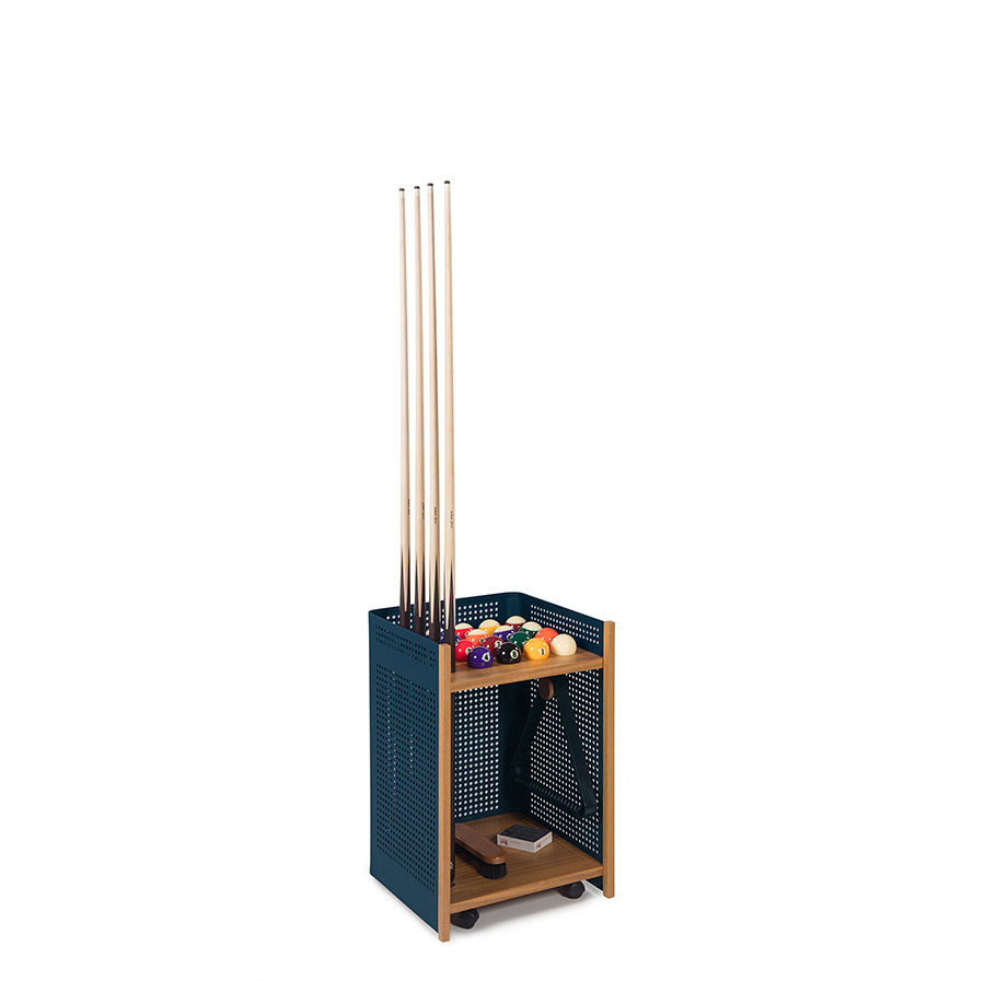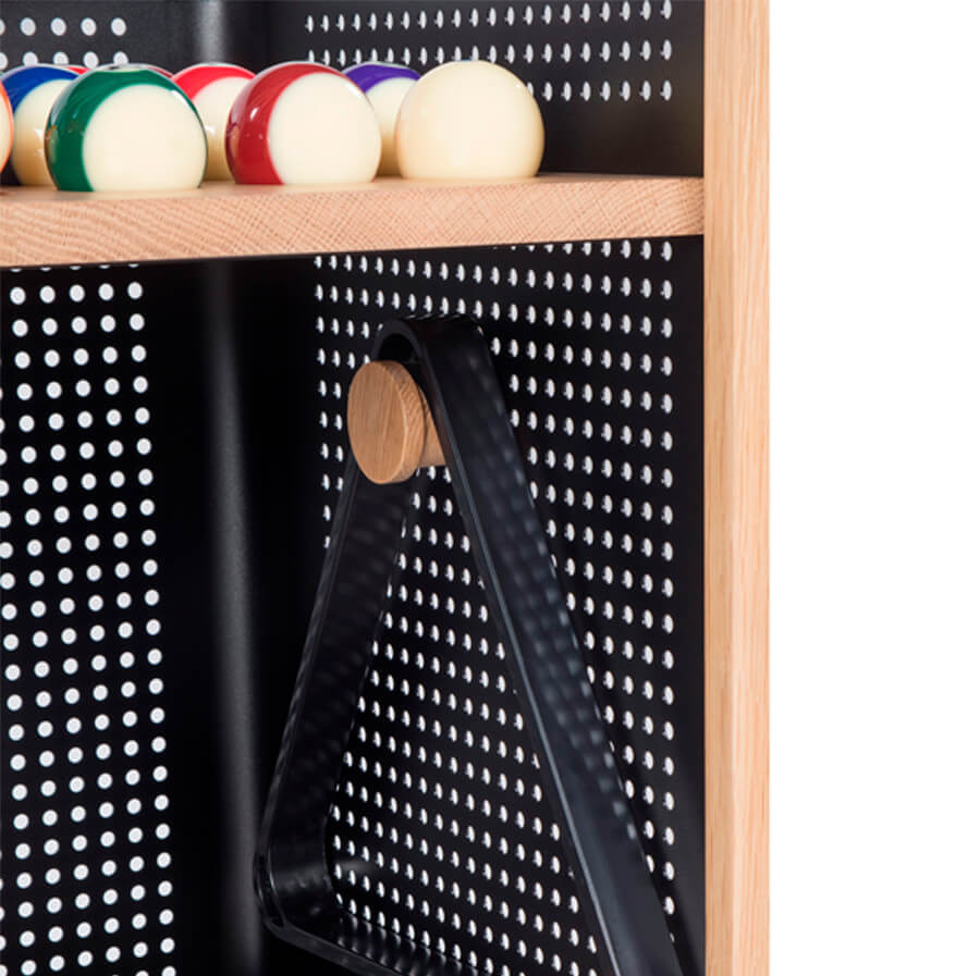 Designed with the same sleek lines as the Diagonal pool table, it’s an essential accessory for anyone who falls in love with this elegant pool table, fulfilling two functions: it’s a storage unit for your pool accessories after the game, and it’s a companion unit while you play, elegantly and harmoniously skirting around the table.
