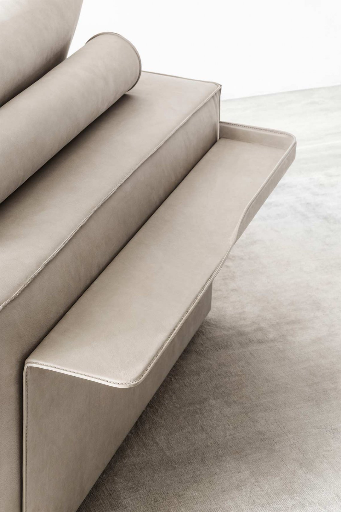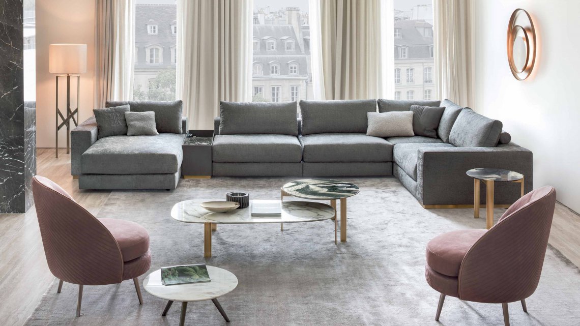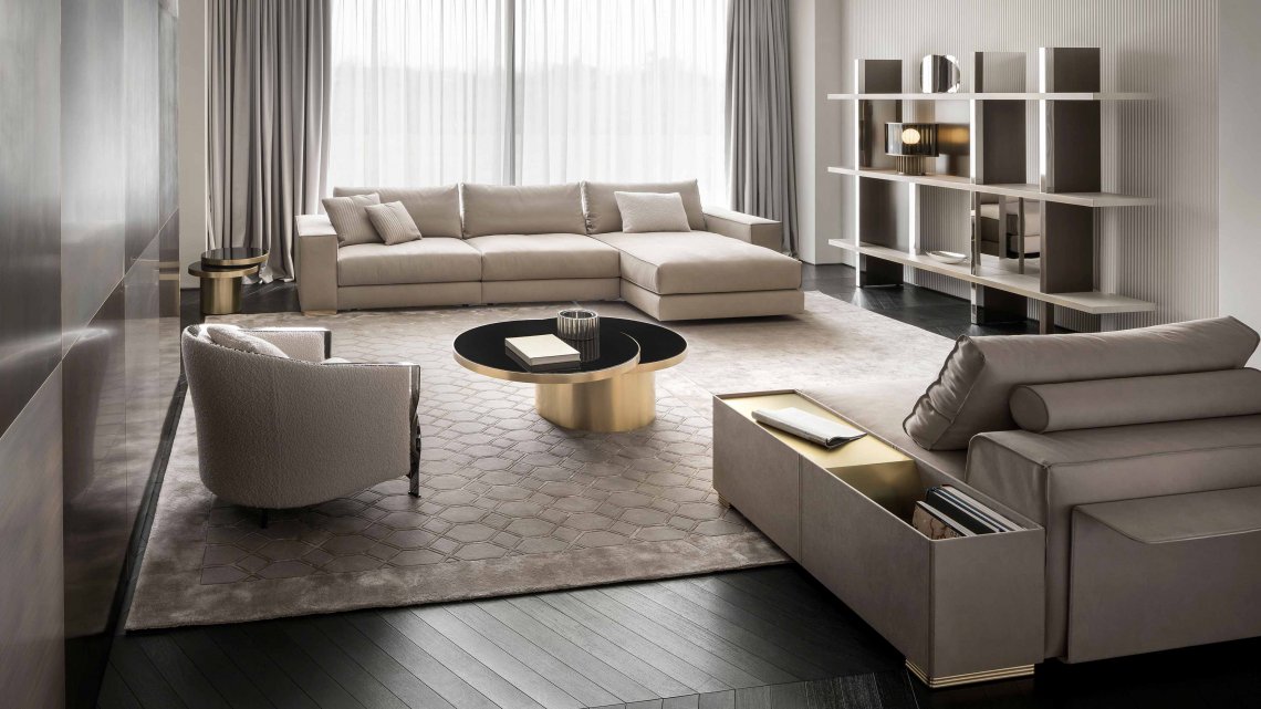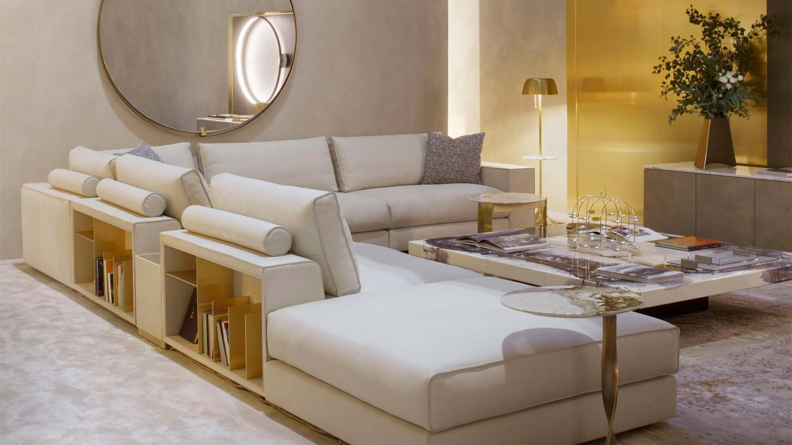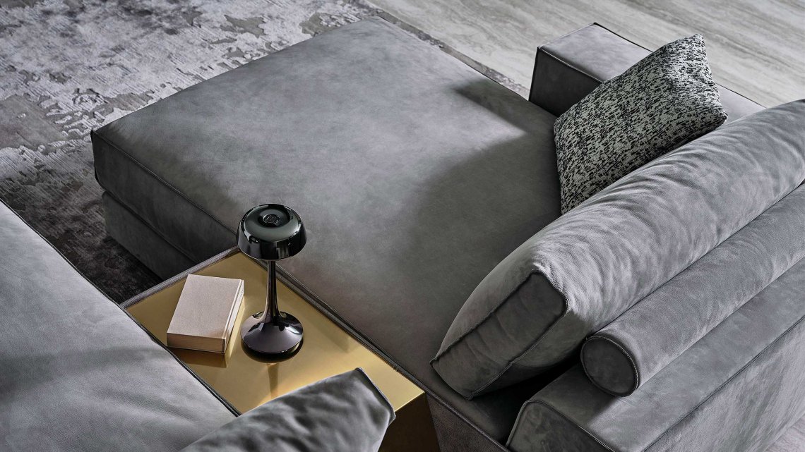 模塊化沙發(fā)系列以書架扶手、擱板靠背和邊桌單元為特色。還采用生切皮革。