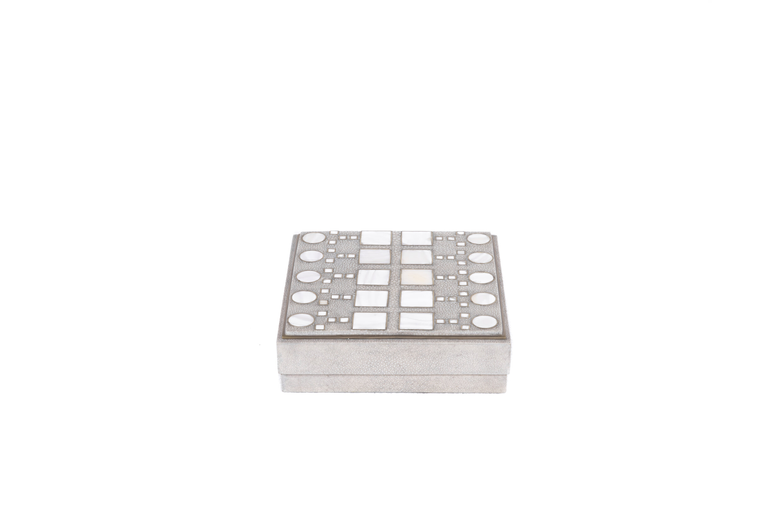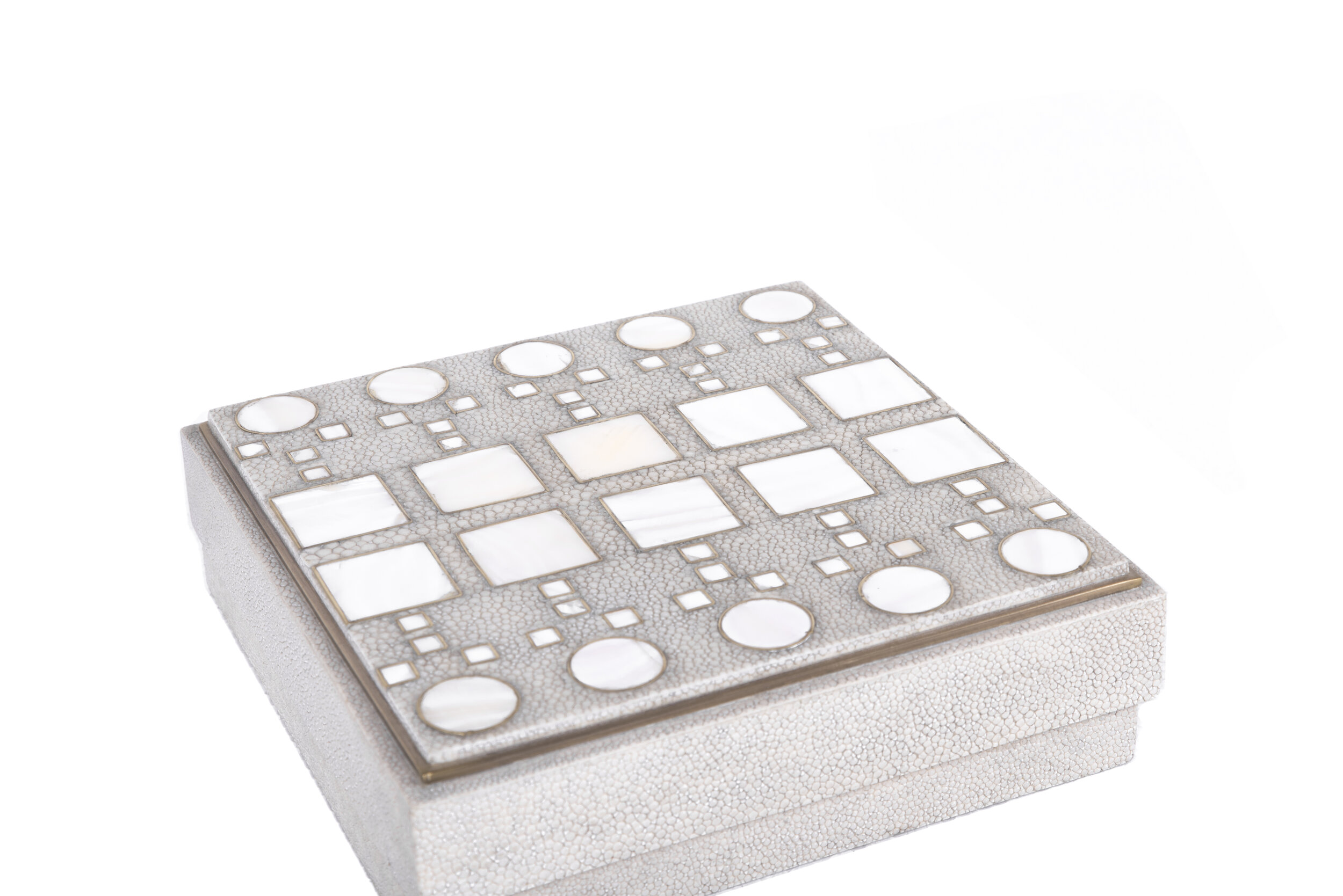 This classic box is a luxurious update to the everyday staple accent. The Klimt pattern gives the box another beautiful element to the box, demonstrating the incredible inlay work of Augousti artisans using a mixture of shagreen, shell and bronze-patina brass.