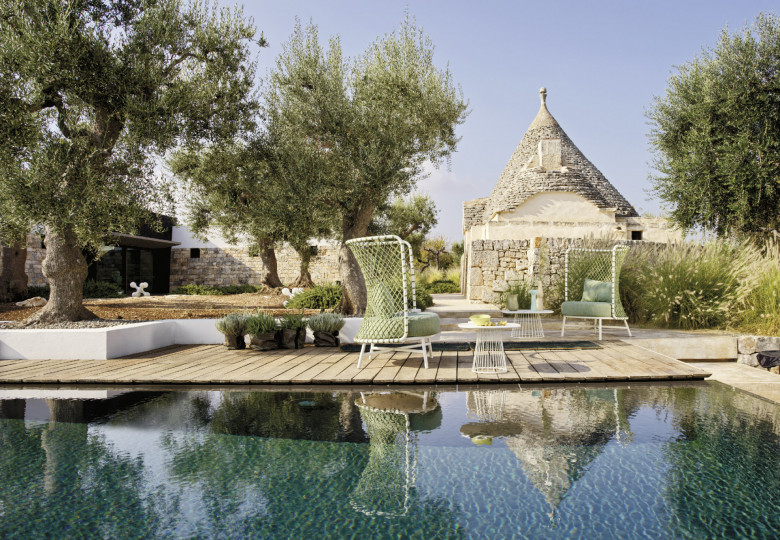 Pouf in alluminio verniciato a polveri, intrecciato con Round Searope. Pratico e dal gusto finemente classico, perfetto per accompagnare la poltrona coordinata. Adatto per interno e per esterno, sia in contesti residenziali che contract.