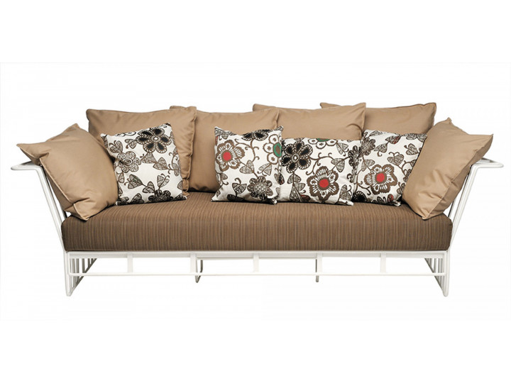 Divano in acciaio 304 verniciato a polveri, intrecciato con Flat Trendyrope. Un divano accogliente, dove la particolare geometria dello schienale si coniuga perfettamente al desiderio di comfort, creando un angolo per vivere momenti di relax. Ottimo per arredare terrazzi e patio, dona forte personalità anche alle zone living interne. Ideale per arredamenti residenziali e contract.