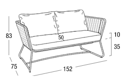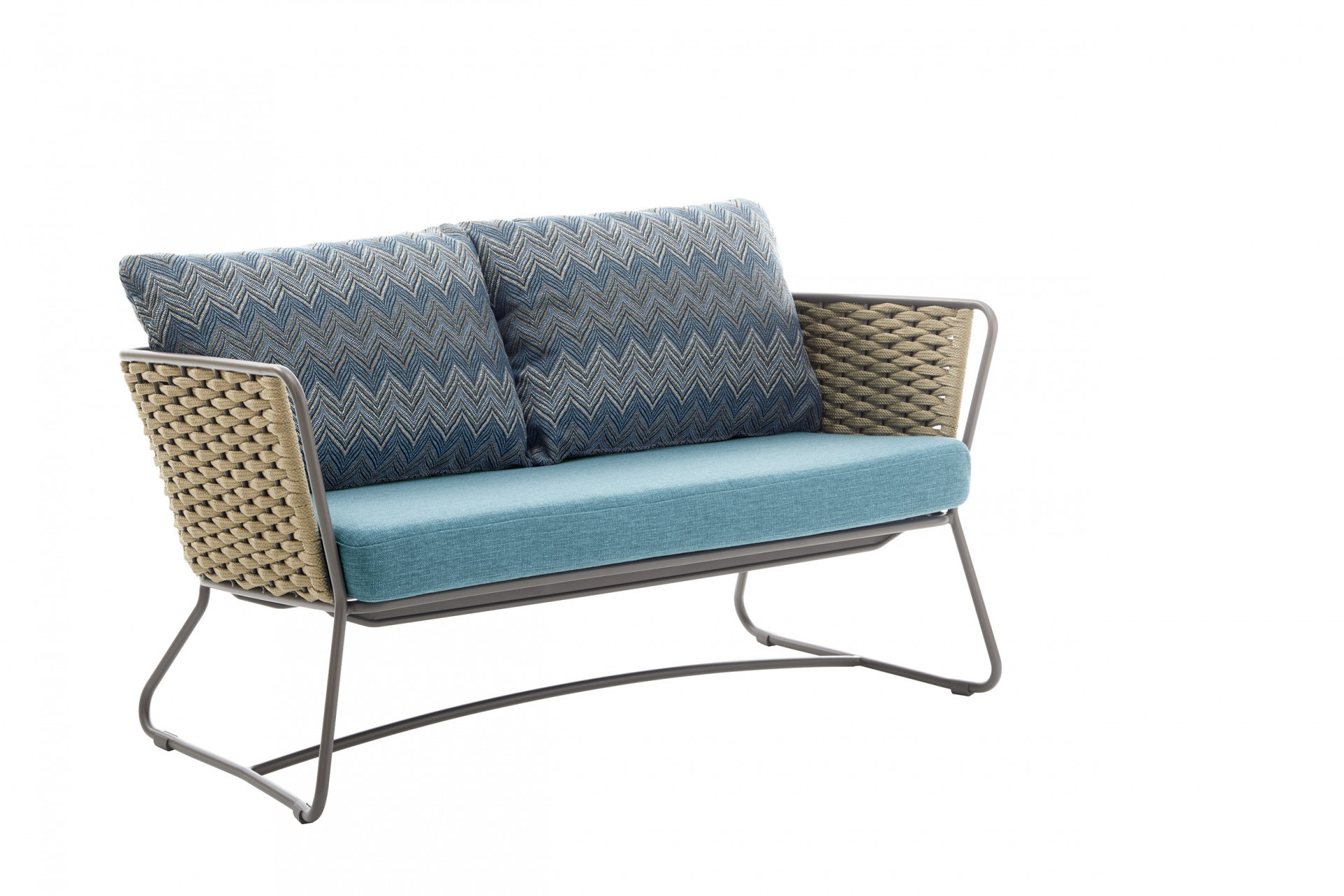 Divano in acciaio 304 verniciato a polveri, intrecciato con Flat Trendyrope. Un divano accogliente, dove la particolare geometria dello schienale si coniuga perfettamente al desiderio di comfort,  creando un angolo per vivere momenti di relax. Ottimo per arredare terrazzi e patio, dona forte personalità anche alle zone living interne. Ideale per arredamenti residenziali e contract.