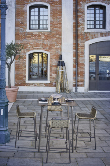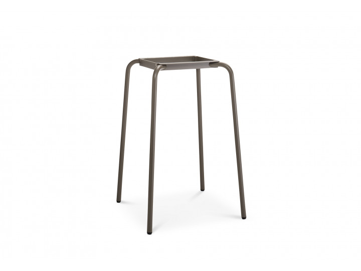 Base tavolo con colonna e crociera sotto-piano in alluminio. Verniciatura a polveri (RAL 9006). La colonna poggia su una base tonda, ideale per l’arredamento esterno di bar e ristoranti sia in situazioni contract che residenziali.