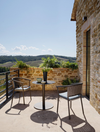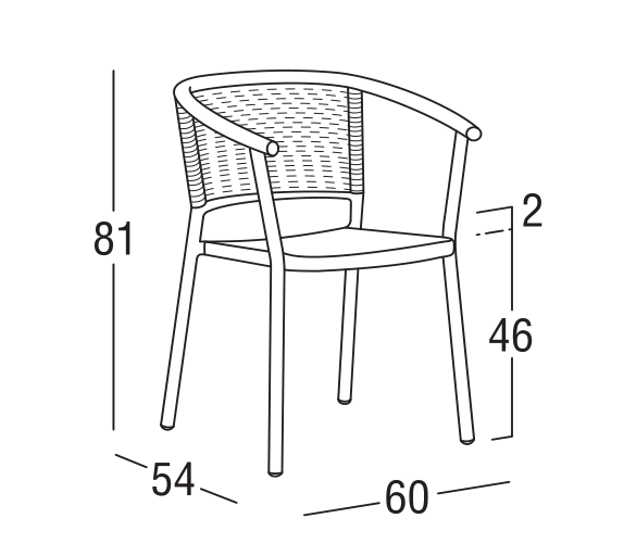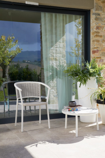 Sedia con braccioli in alluminio verniciato a polveri, intrecciata con Oval Searope. Il design crea un elegante abbraccio, mentre l'intreccio sapientemente interpretato completa la raffinata semplicità di questo elemento, perfetto per creare un ambiente accogliente sia in contesti residenziali che contract, facilmente impilabile e adatta per interno ed esterno.