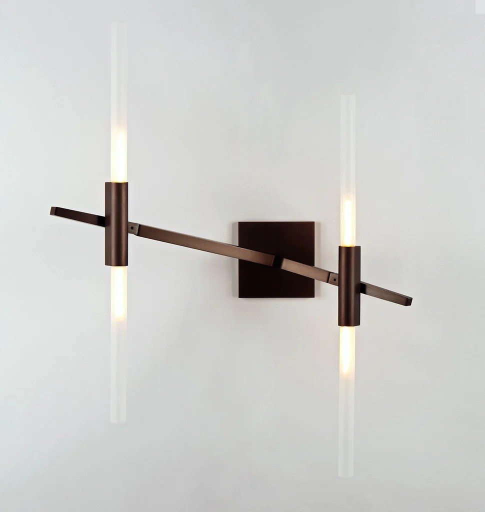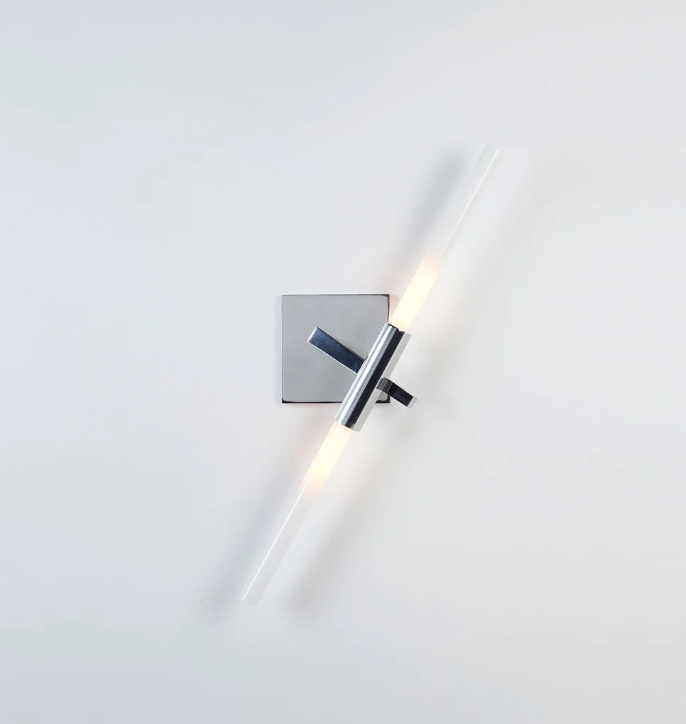 Originally conceived as a candelabra, Agnes takes its inspiration from the fictional heroine of the same name, a worker in the world's oldest profession during the 1849 California Gold Rush. The modular system would allow Agnes easy setup in her makeshift "workspace." In this version, glowing glass tubes replace the candles. Articulated joints allow the glass to be arranged in a multitude of ways.