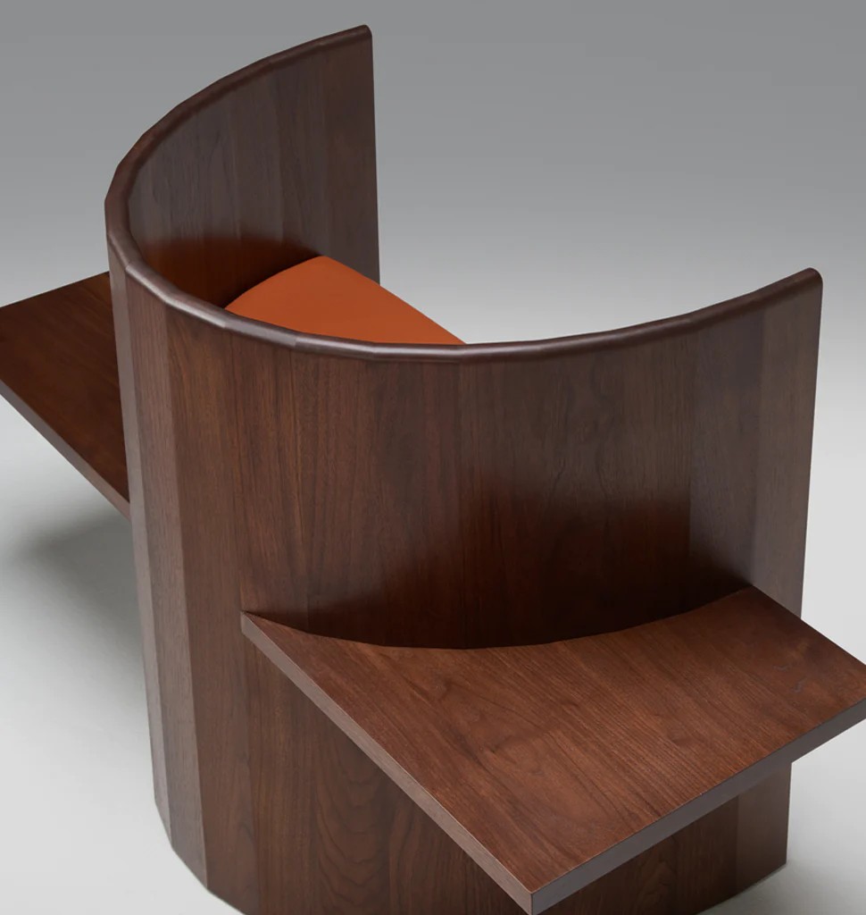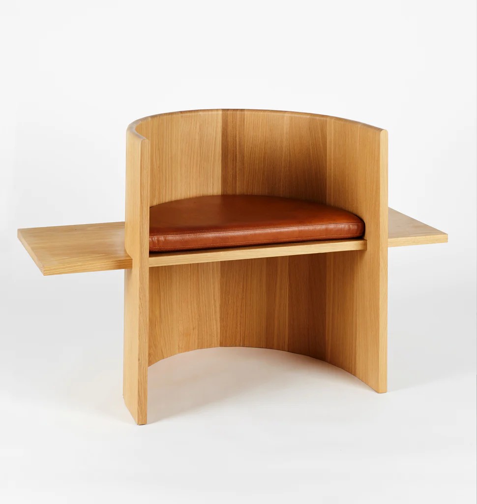 Chair is table. Table is chair. Sit, Set Chair is made entirely of solid wood and without the use of mechanical fasteners, applying ancient folk methods in innovative ways. A coopered, ergonomic arc cradles the back and a horizontal plane fitted with a plush leather cushion supports the sitting body.