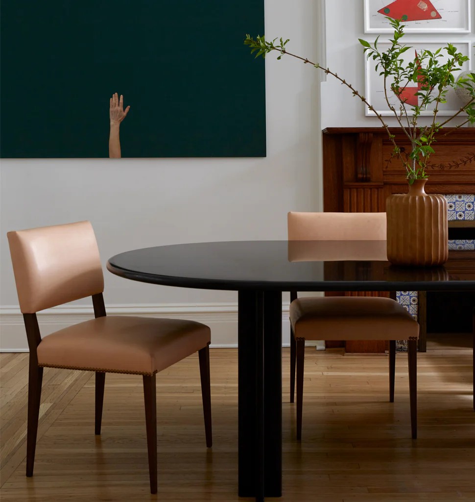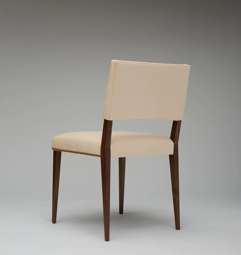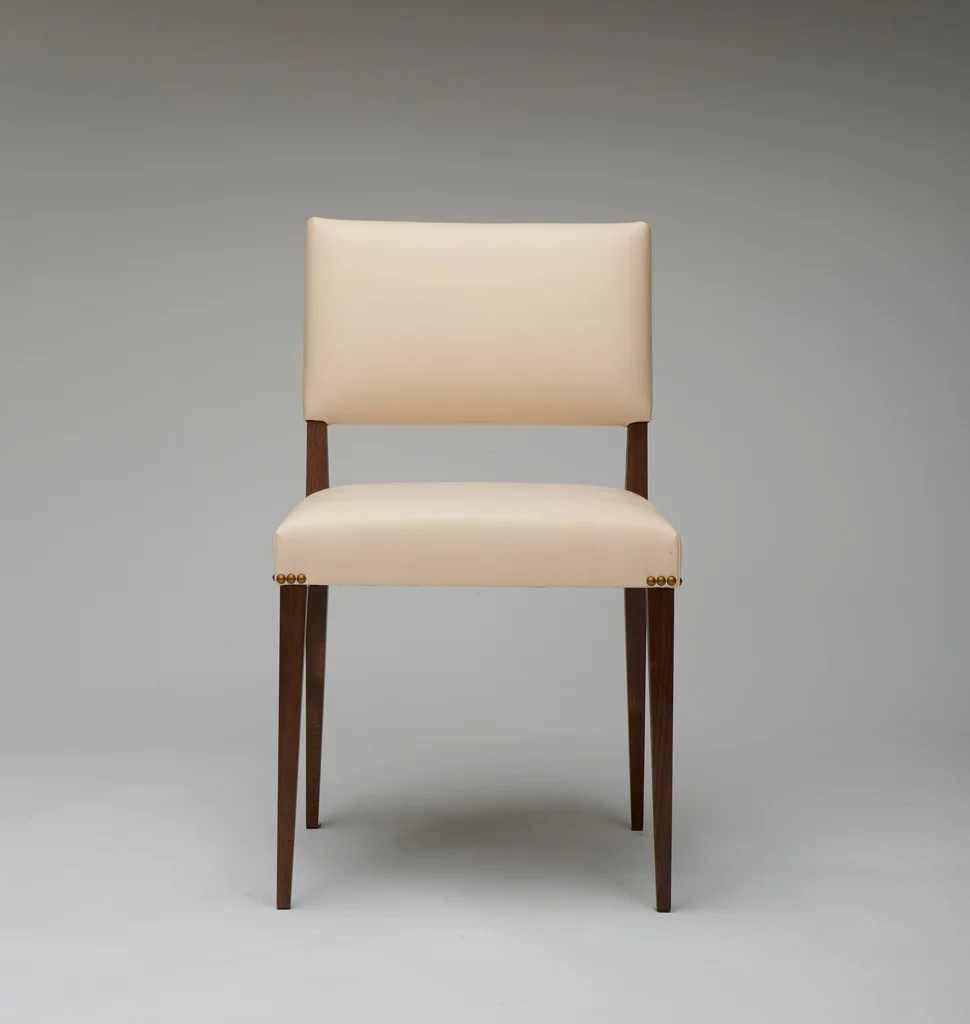 The stately silhouette of The Lion is reminiscent of a traditional Louis XIV dining chair and modernized through clean lines and pared-down details. Its thronelike stature is sculpted with an upright frame, while its delicate legs and natural leather upholstery add a hint of glamour.