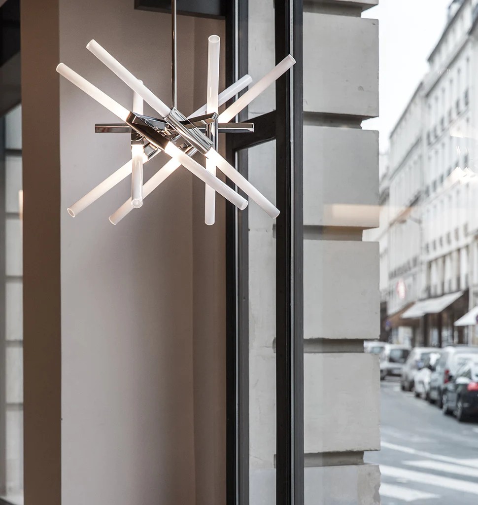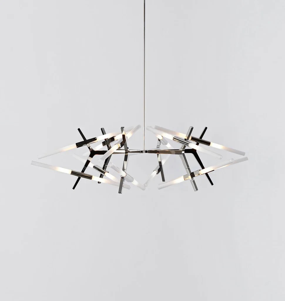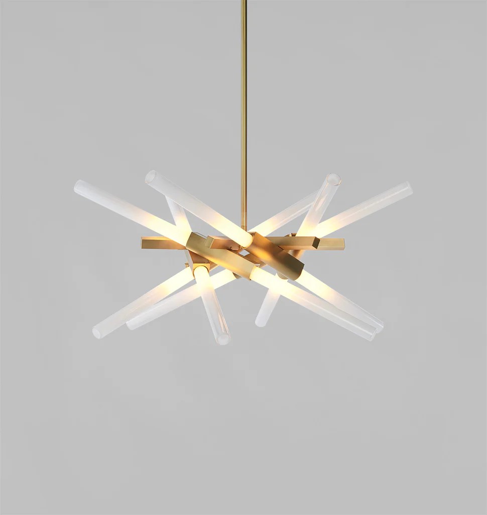 Based on Lindsey Adelman's Agnes collection, Astral Agnes reconfigures the modular units of the original series into radial, symmetrical forms that channel galactic phenomena and space travel.