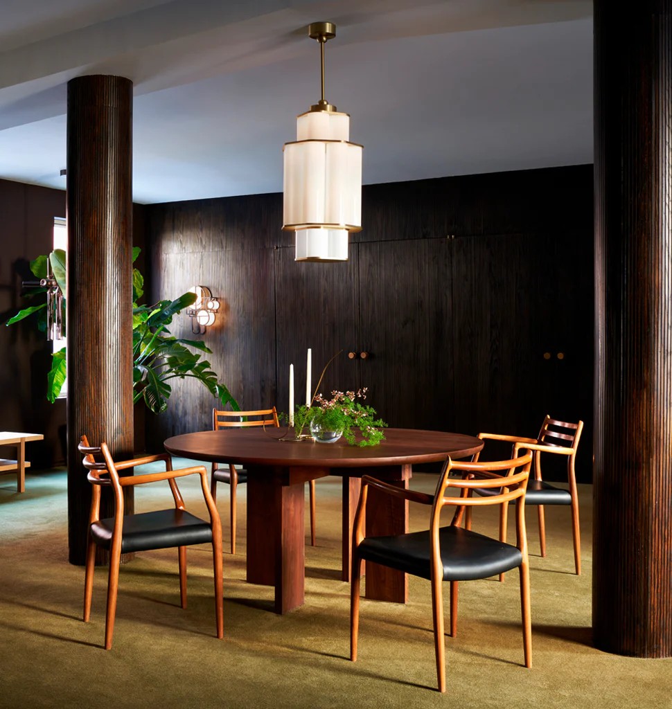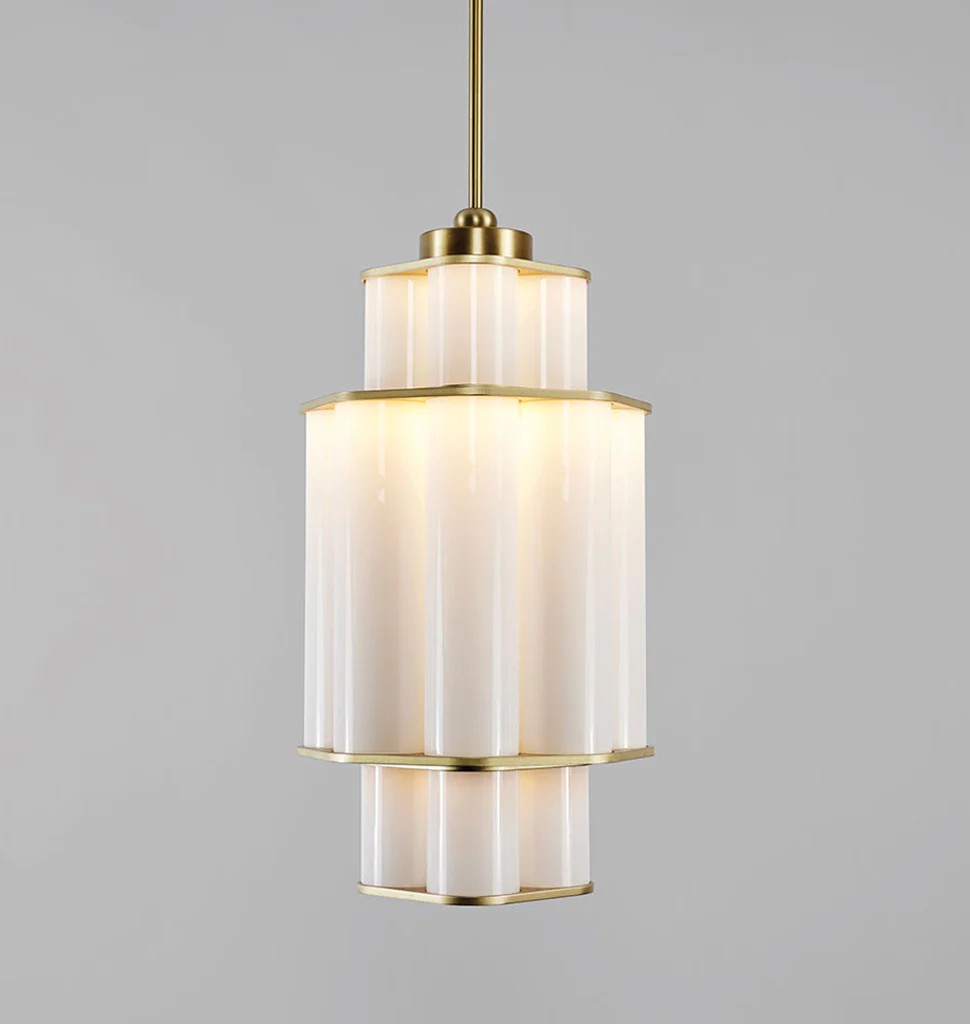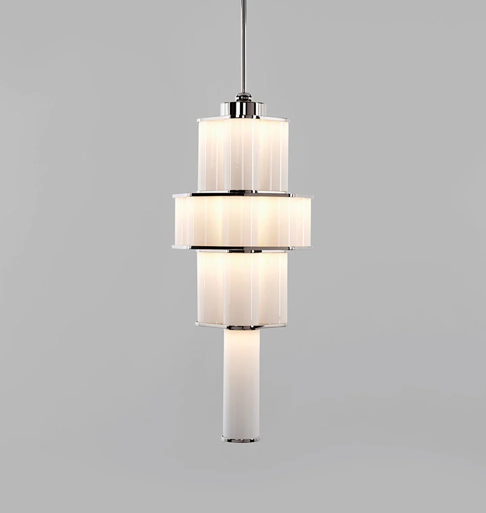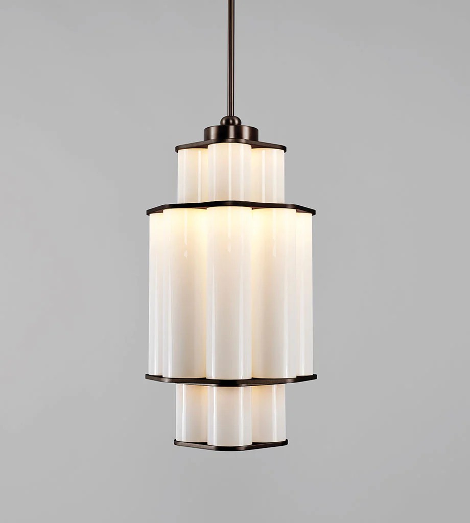 Jason Miller's Bauer is a pendant fixture made of stacked, concentric clusters of handblown tubular glass. The glass fades from dark to light, recalling the tonalities of earth-to-sky views, producing an ethereal, atmospheric effect.