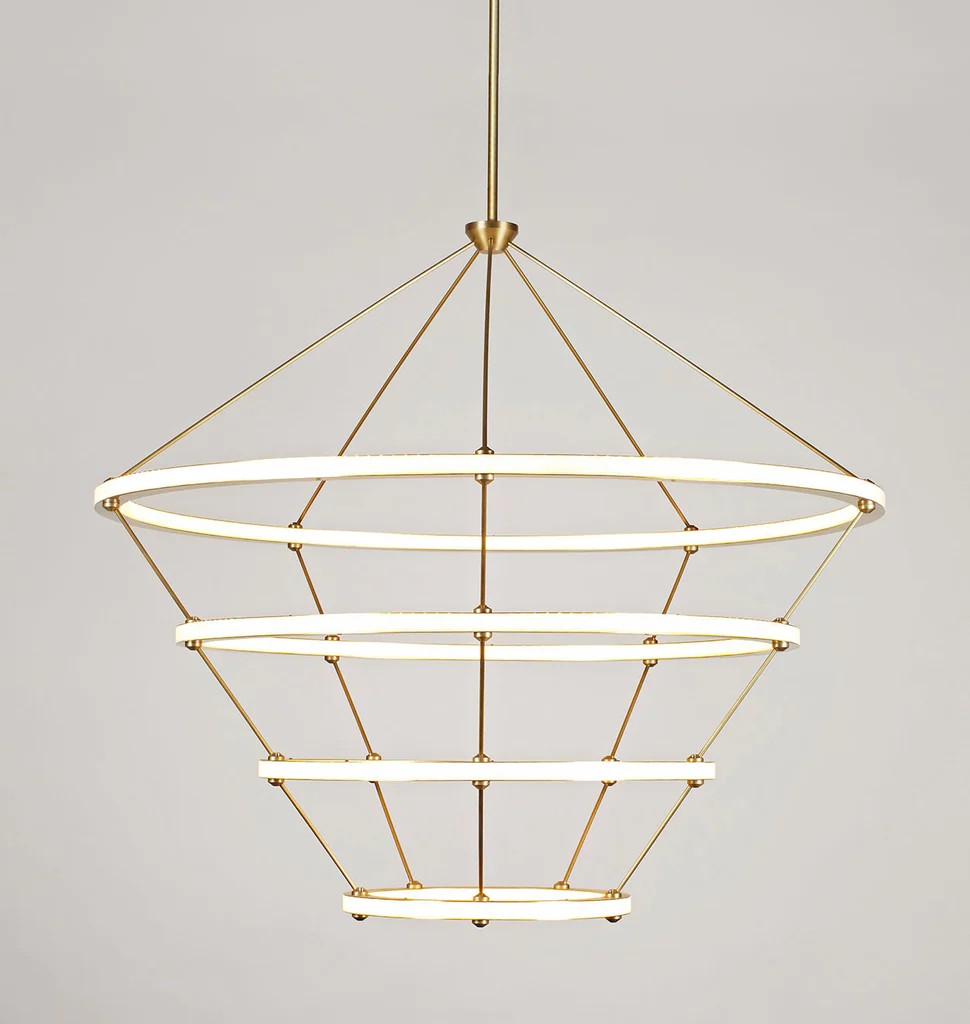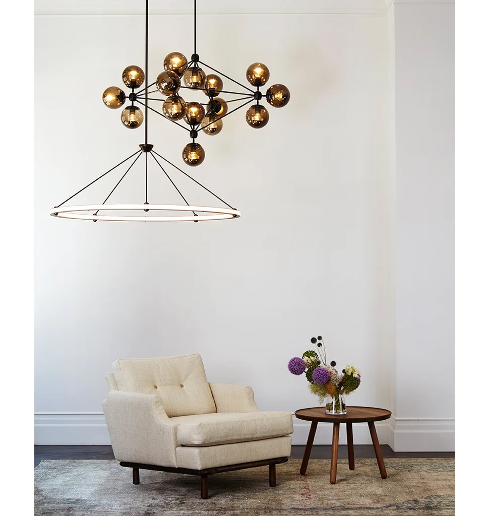 Paul Loebach envisioned the Halo series as a graceful exercise in the use of energy-efficient LED technology. The collection, which includes a range of ceiling and wall lights, is distinguished by its use of cascading rings and bars of light.