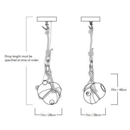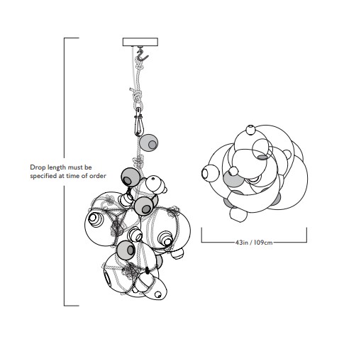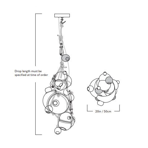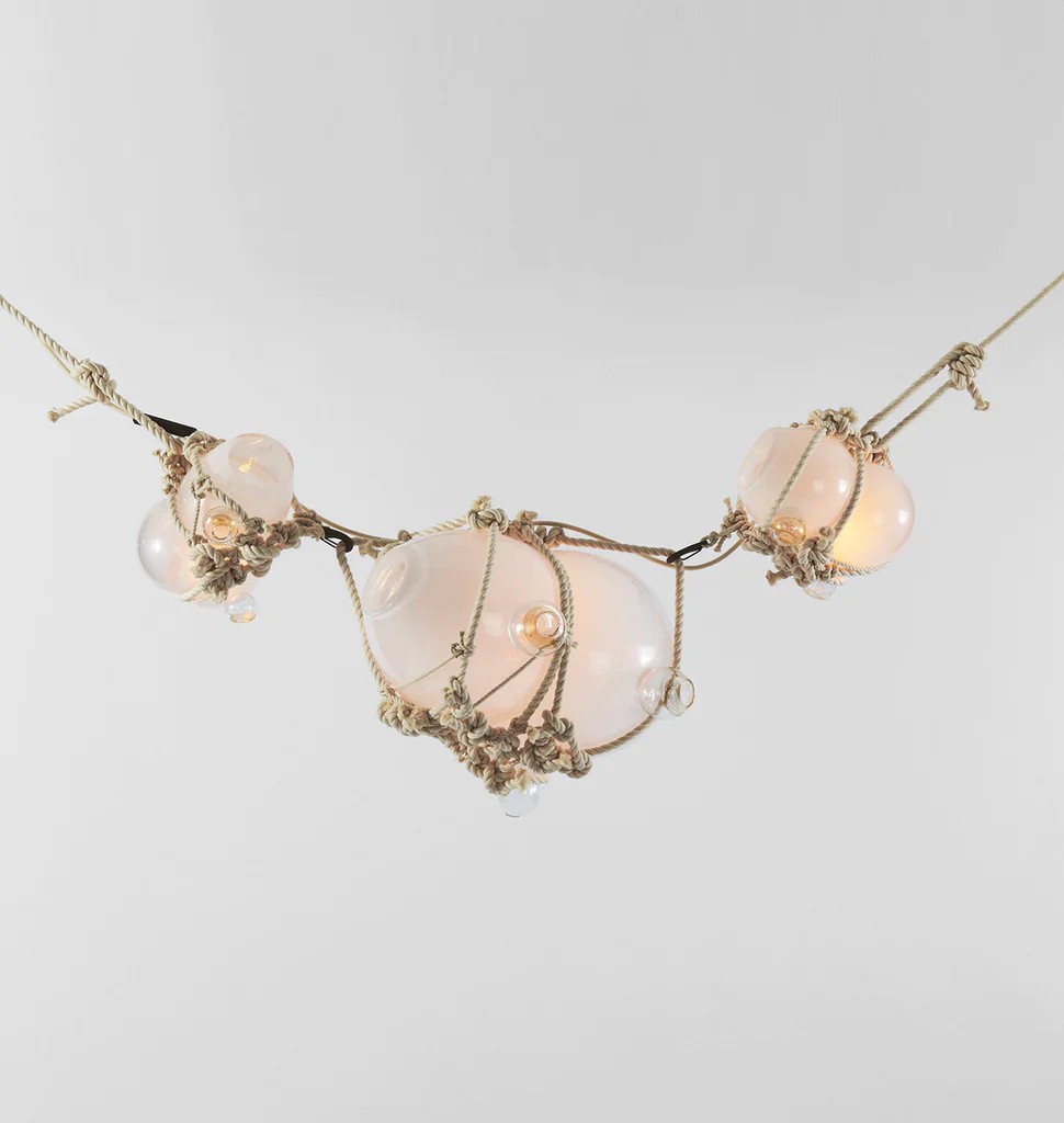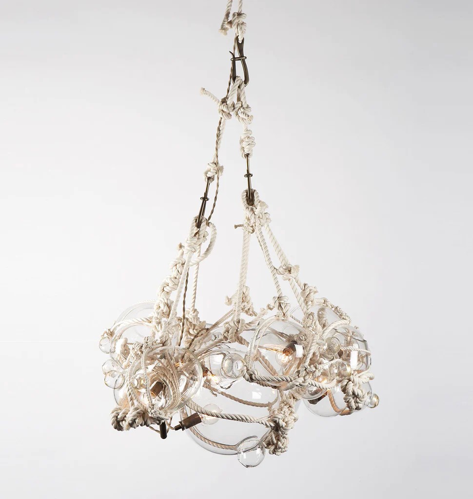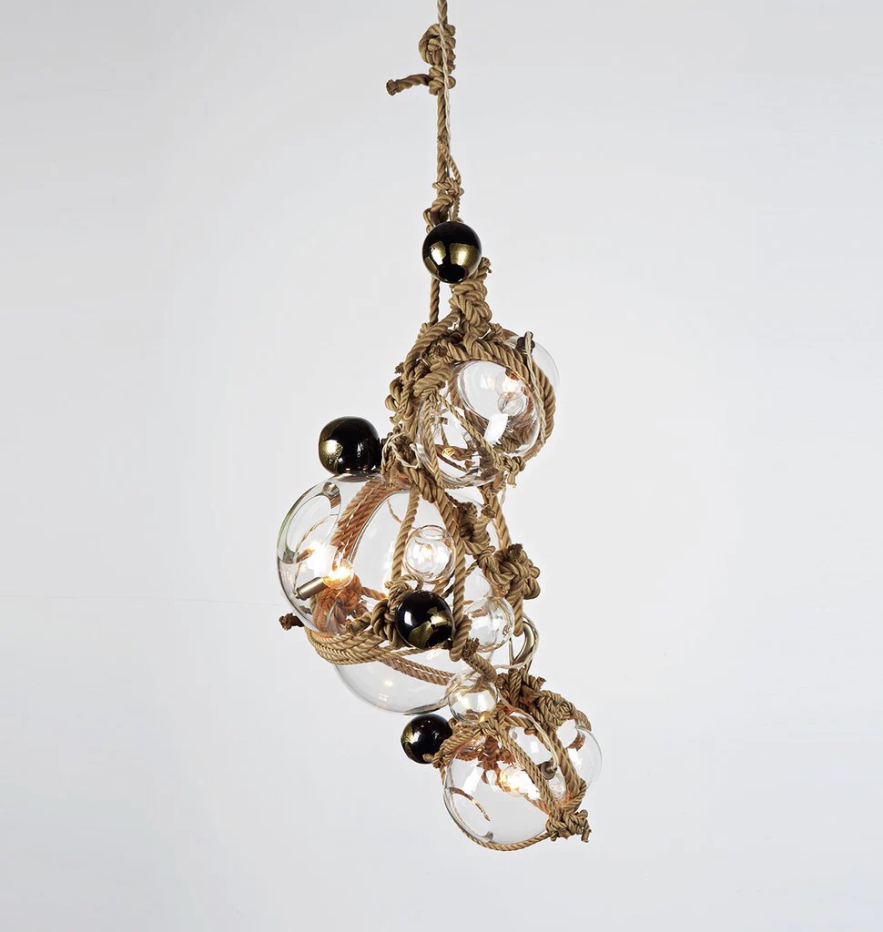 Inspired by Japanese packaging, buoys, and shibari, Knotty Bubbles is a sculptural light made of hand-blown glass 'bubbles' bound together with knotted rope.