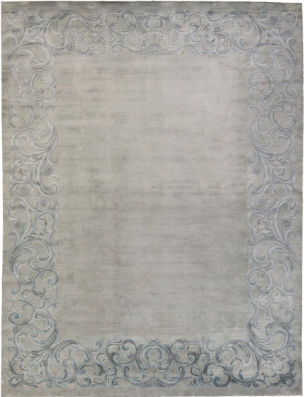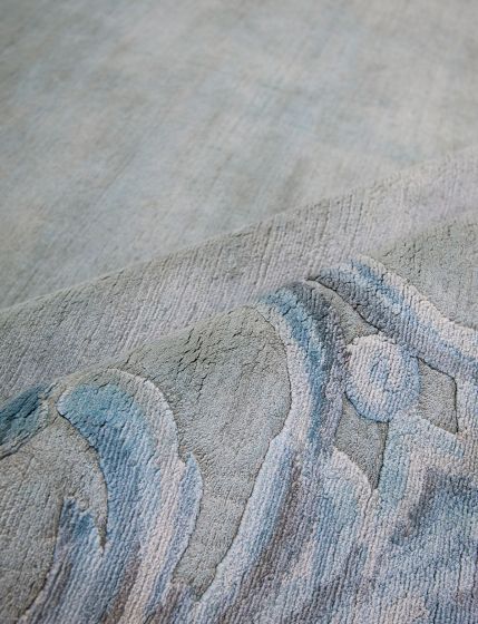 One of the luxury dining rugs in the Collection, this design is created from the finest natural silk featuring a brocade pattern border surrounding a plain center. The soft blue colour combined with the sheen and softness of the silk texture gives this rug an undeniable beauty. This design comes in handknotted finish only in:Silk and Silk Relief