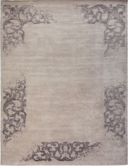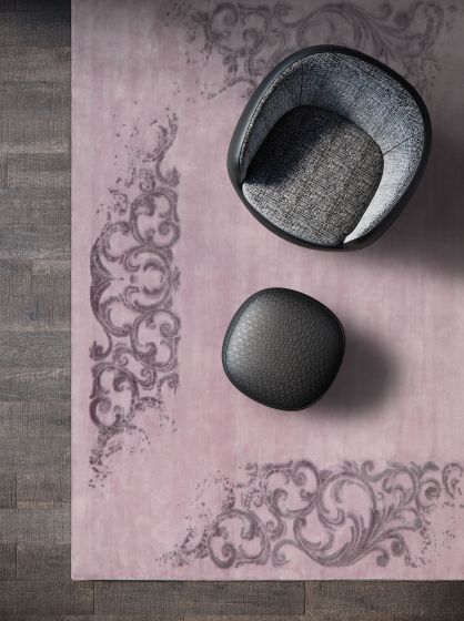 This design features a brocade pattern border interrupted by plain weave giving it a faded-away effect. The lilac colour combined with the sheen and softness of the silk texture gives this rug a particular subtleness. It comes in handknotted finish in:Silk and Silk Relief