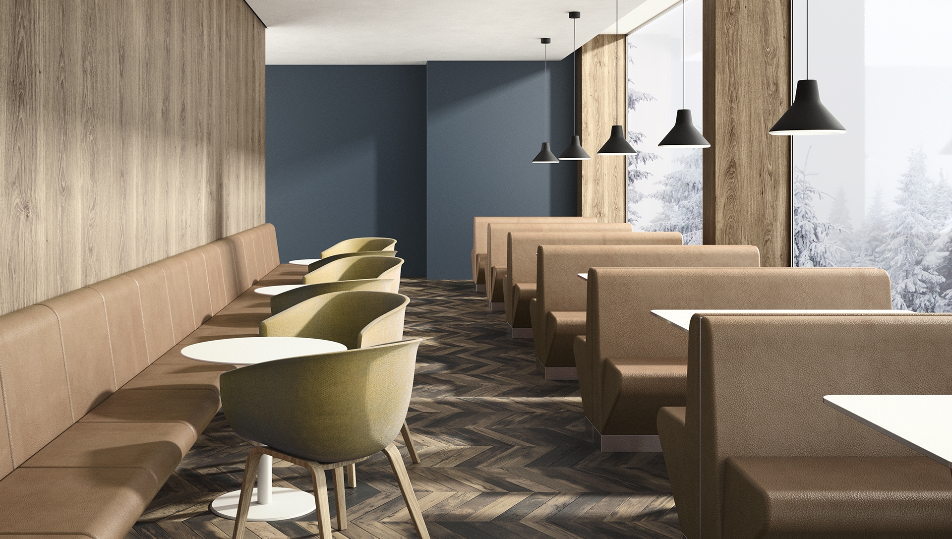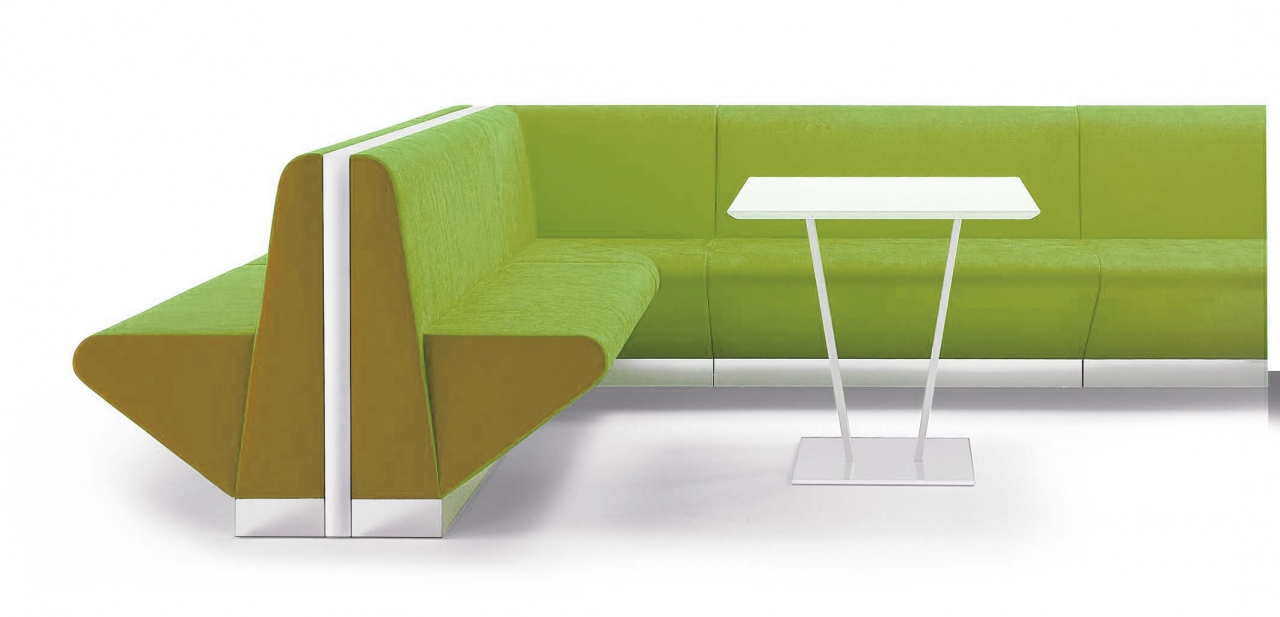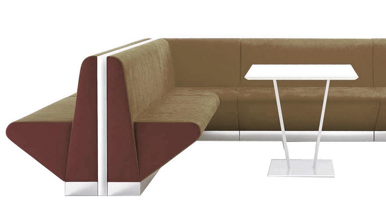 Various modules with free standing or wall mounting options allow the user to achieve numerous compositions. Perfect for large environments, for waiting spaces, eating areas. or working places. This is Jo Bar, a system of modular upholstered benches with wood frame, base in metal, and covers in various colours and materials.