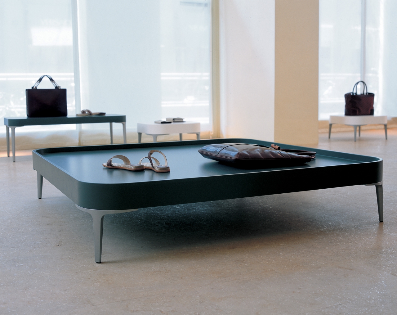 Alphatables, a series of multipurpose low tables with essential and soft lines. Thin die cast aluminum legs, in powder coat or chrome finish, combined with polyurethane tops with or without lip. Three dimensions and three colours that enhance their shape.