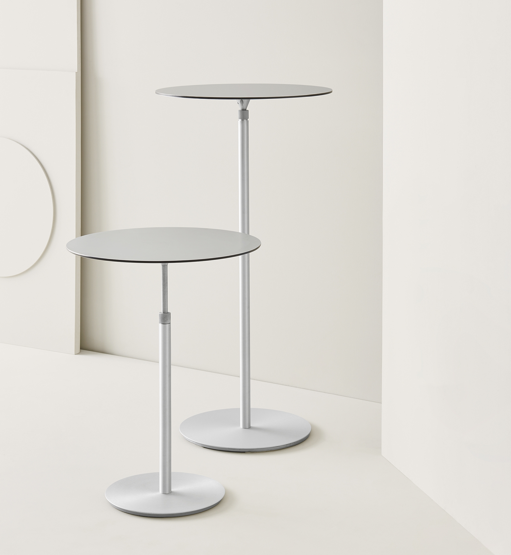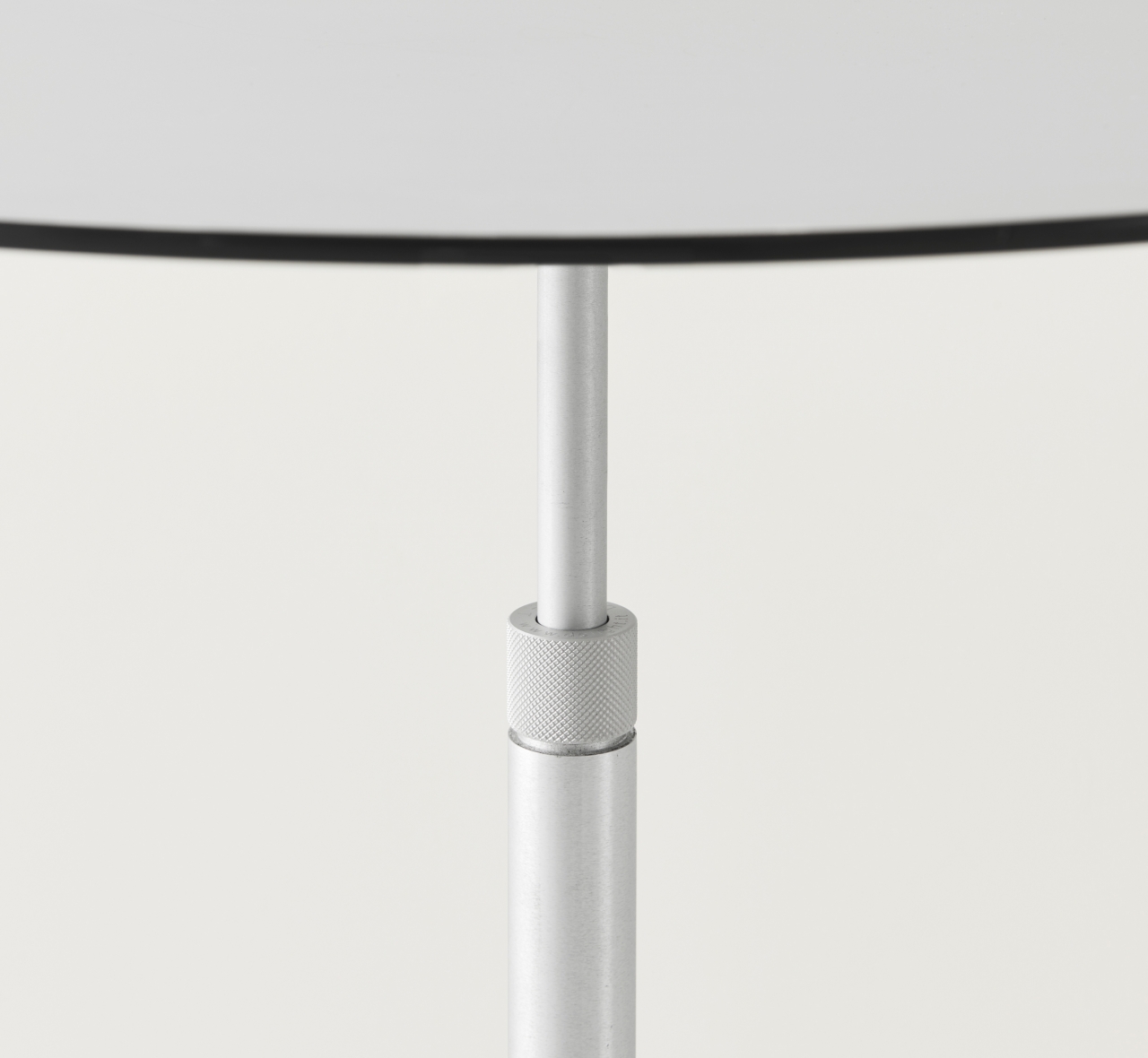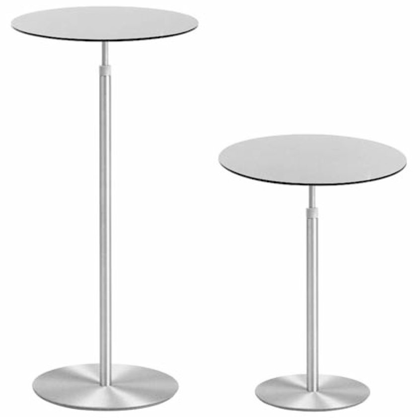 One finish only for an elegant and versatile table in satin anodized aluminIum with a top of a special high resistance aluminum and rubber sandwich with PVC shock resistance edge or HPL laminate. Available in two versions: a height adjustable low or fixed height high table.