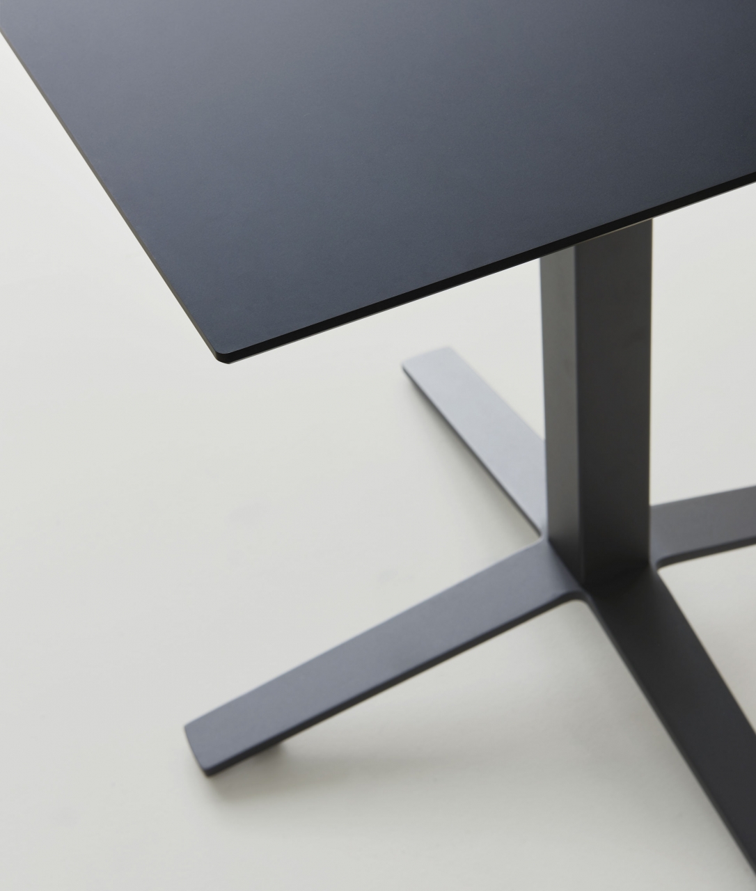 A simple hand, witness to an ancient culture, reveals itself in primary geometrics that are as minimal as they are recognizable. The upright steel column rests against the crossed strips at the table’s base. These work in combination with plywood tabletops, laminated MDF or HPL to accommodate a variety of needs.