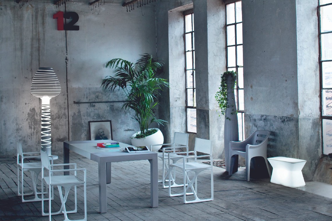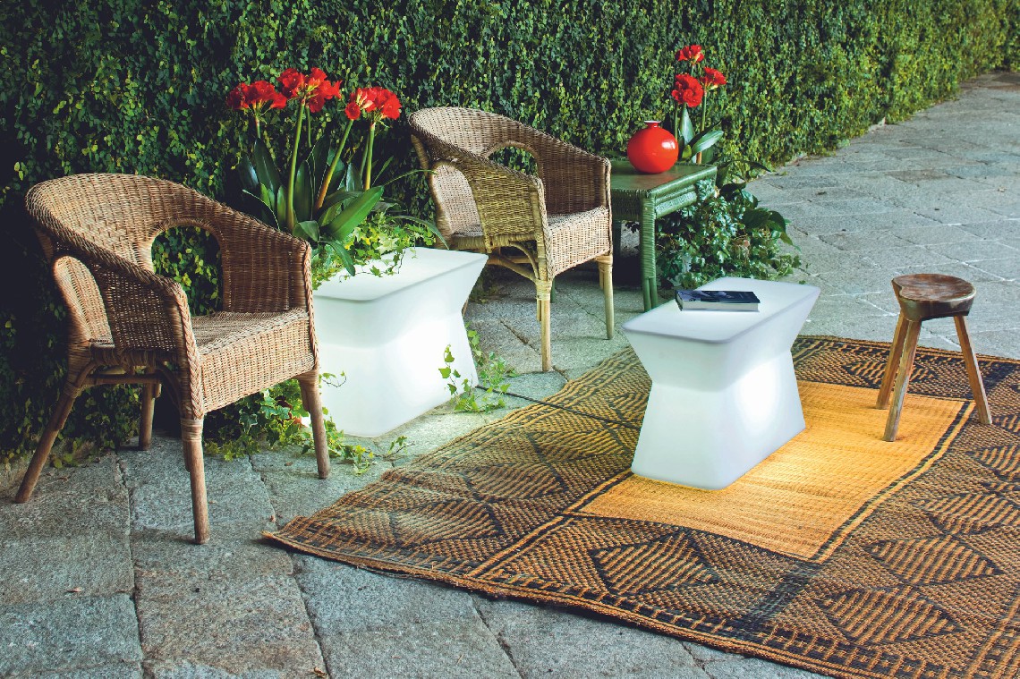 Pyramid shapes merge together to create rectangular garden tables with rounded edges.
